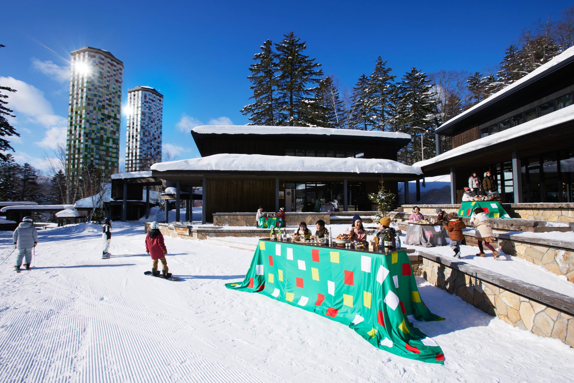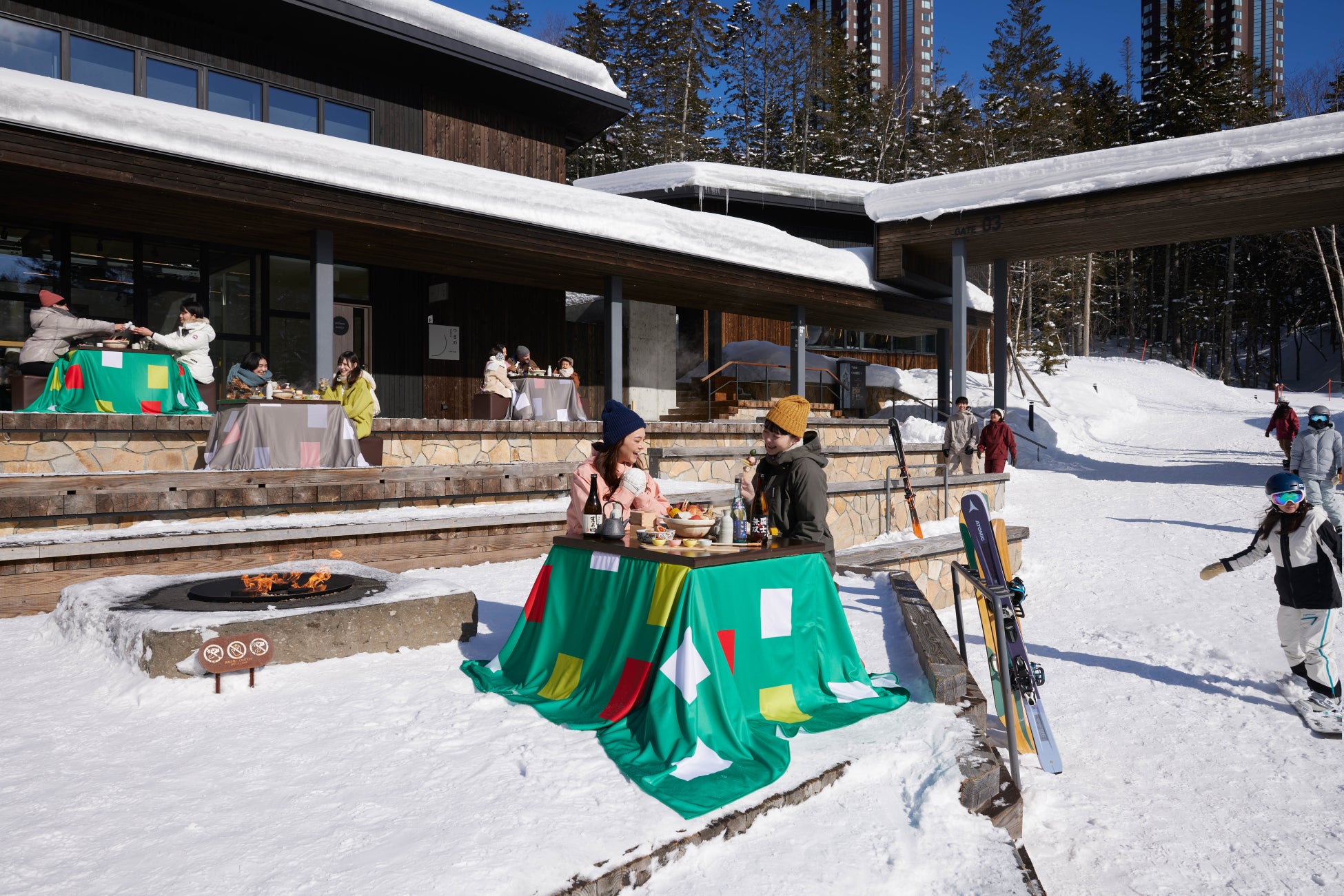 今冬は、ゲレンデの中腹に位置するホタルストリートに、トマムのランドマークであるトマム ザ・タワー柄のこたつを設置。トマム ザ・タワーは、夏と冬の森をイメージしてデザインされたホテルです。雪景色の中のこたつと奥に見えるホテルを、思わず一緒に写真を撮りたくなるスポットに進化しました。そのこたつのそばにはスキーラックがあり、家族や友人とスキーやスノーボードを楽しむ合間に、手軽にこたつを利用することができます。また、ホタルストリートは、トマム ザ・タワーとリゾナーレトマムの両方からのアクセスが良く、滑らない人もこのこたつでゲレンデを眺めながら、温まることができます。