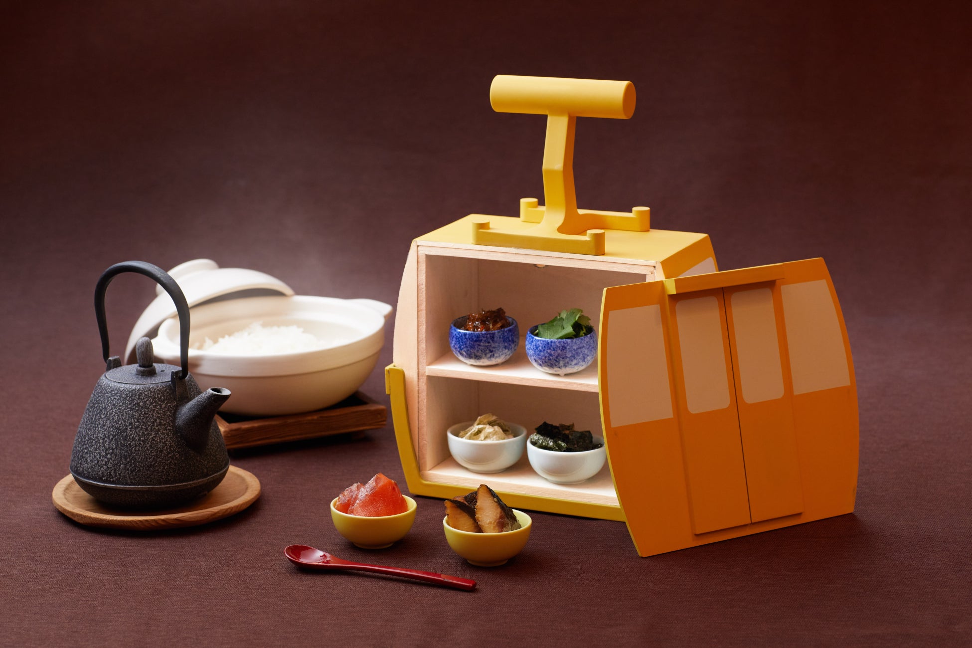昨年好評だったスペシャルおでん鍋を最後の出汁まで味わい尽くせるよう、今冬はスペシャルおでん鍋の締めセットが登場。土鍋で炊いたご飯に、魚介の旨味たっぷりの出汁と、付け合わせの北海道らしい食材をのせて、お茶漬けとして楽しめます。付け合わせはゴンドラをモチーフにしたコンディメントBOXに乗せて提供。「漬けサーモン」「鰊の甘露煮」「おぼろ昆布」「海苔」「松前漬け」「三つ葉」の6種類が並びます。スペシャルおでん鍋の付け合わせと併せて合計10種類を、お茶漬けにトッピングでき、味の変化を楽しめます。
