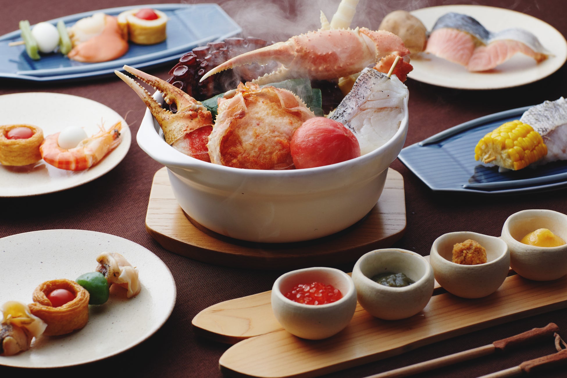 ゲレンデにあるこたつで暖を取りながら、体の内側からも温まれるように、北海道ならではのおでんを提供します。北海道のおでんは、海鮮や山菜の具と昆布出汁が特徴です。昆布出汁がきいたおでんを手軽に楽しめるように、一本から注文できるおでん串にして7種類用意。エビ、鮭など様々な魚介と山菜の組み合わせが楽しめます。また、バリエーション豊かな具材を鍋で温めながら味わえるスペシャルおでん鍋も提供。カニ、タコなどの豪華な海鮮と、フキやタケノコなどの山菜をふんだんに使用しています。おでん鍋の付け合わせには、いくら、蟹味噌、山わさび、ゆずみそを一緒に提供します。氷点下の屋外で、こたつで暖まりながら味わう熱々のおでんは格別です。