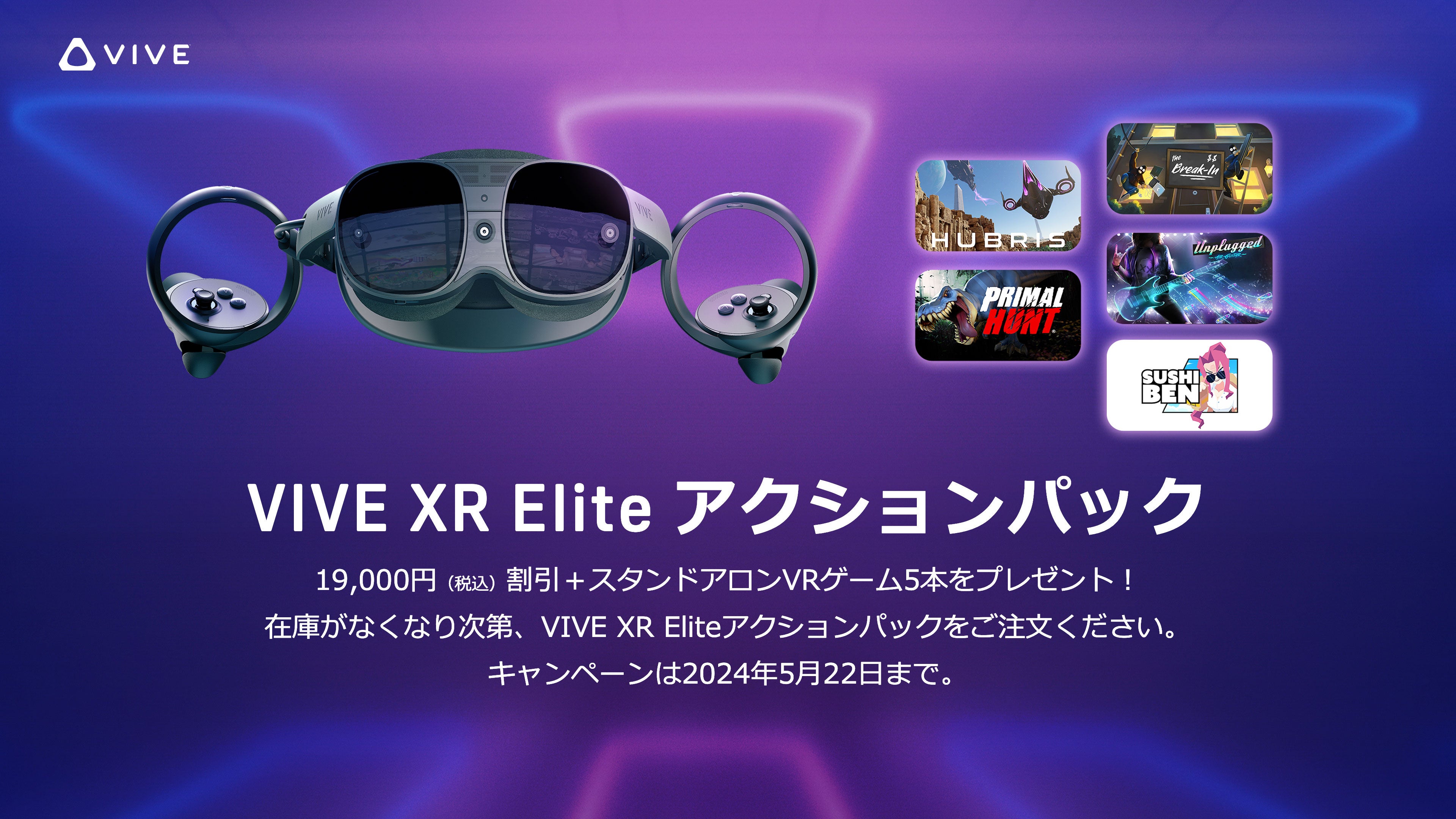 2024年4月25日より5月22日までの期間限定で、179,000円のVIVE XR Eliteが160,000円(19,000円の割引)となります。しかもVIVEPORTで販売している厳選された5つのゲーム(16,000円相当)を無料でプレゼント!合わせて、35,000円相当のお得なキャンペーンです。