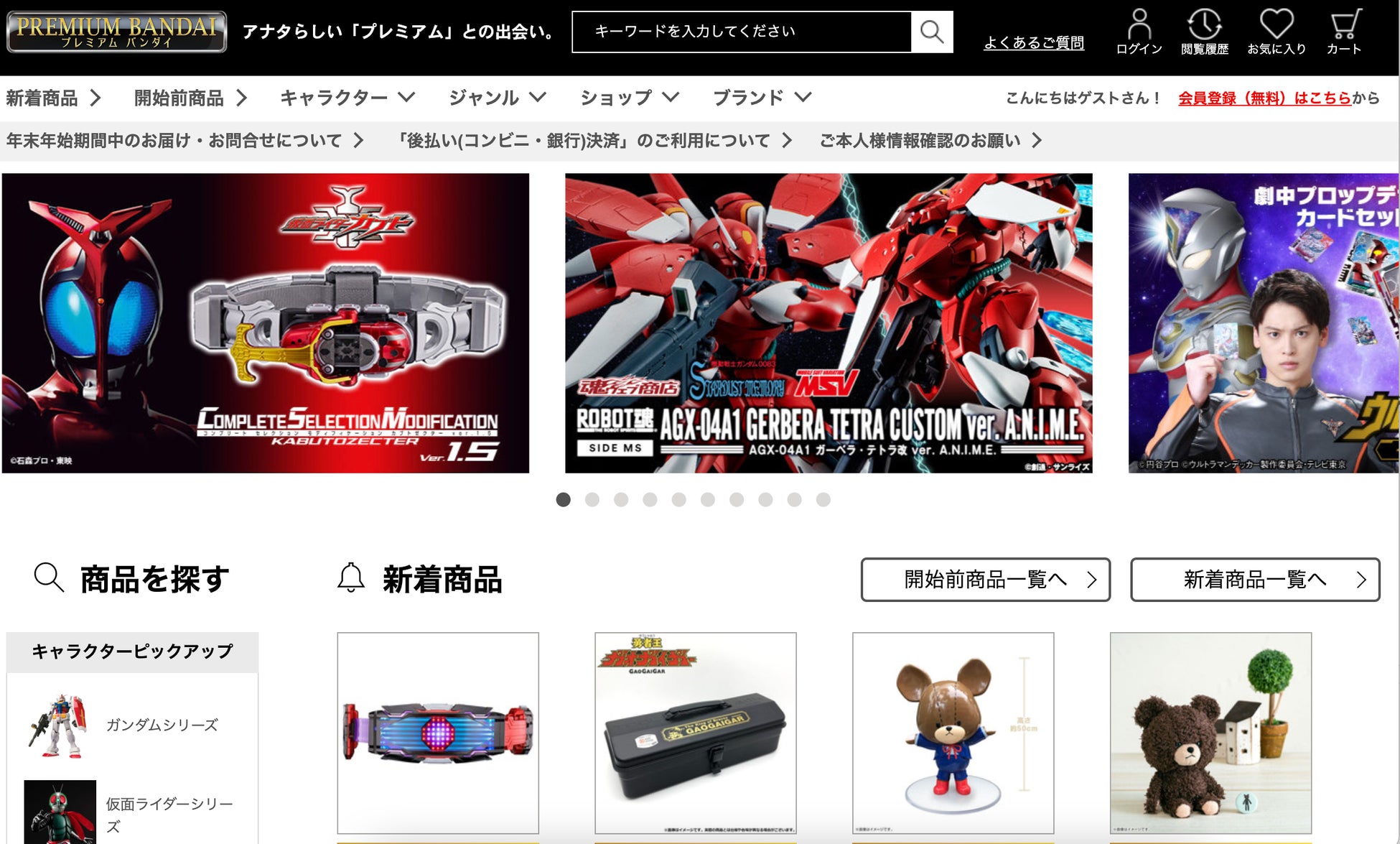 プレミアムバンダイでしか買えない限定商品やさまざまなキャラクター商品を取り扱うショップが集まり、幅広いジャンルの商品を取りそろえています。
