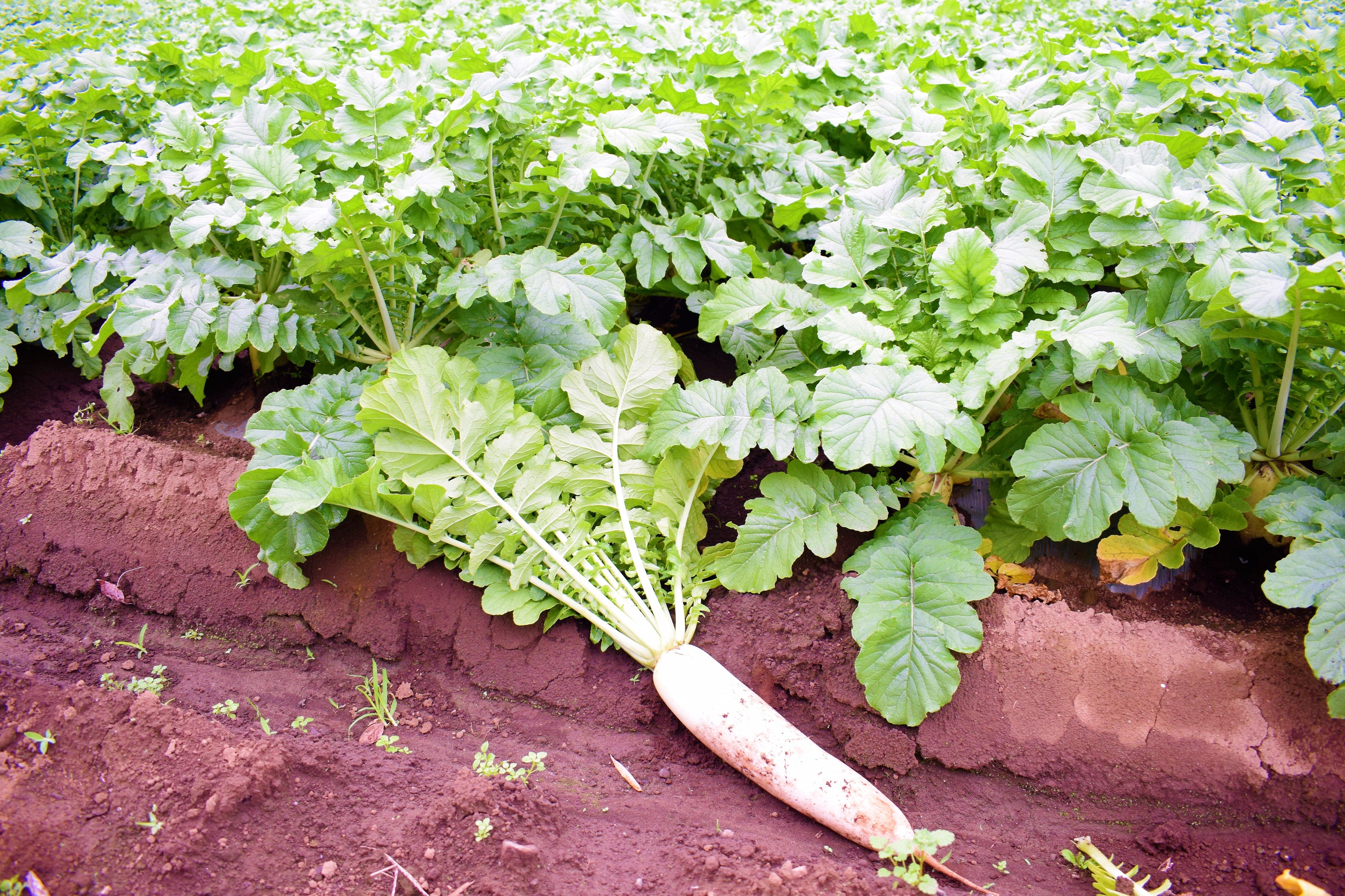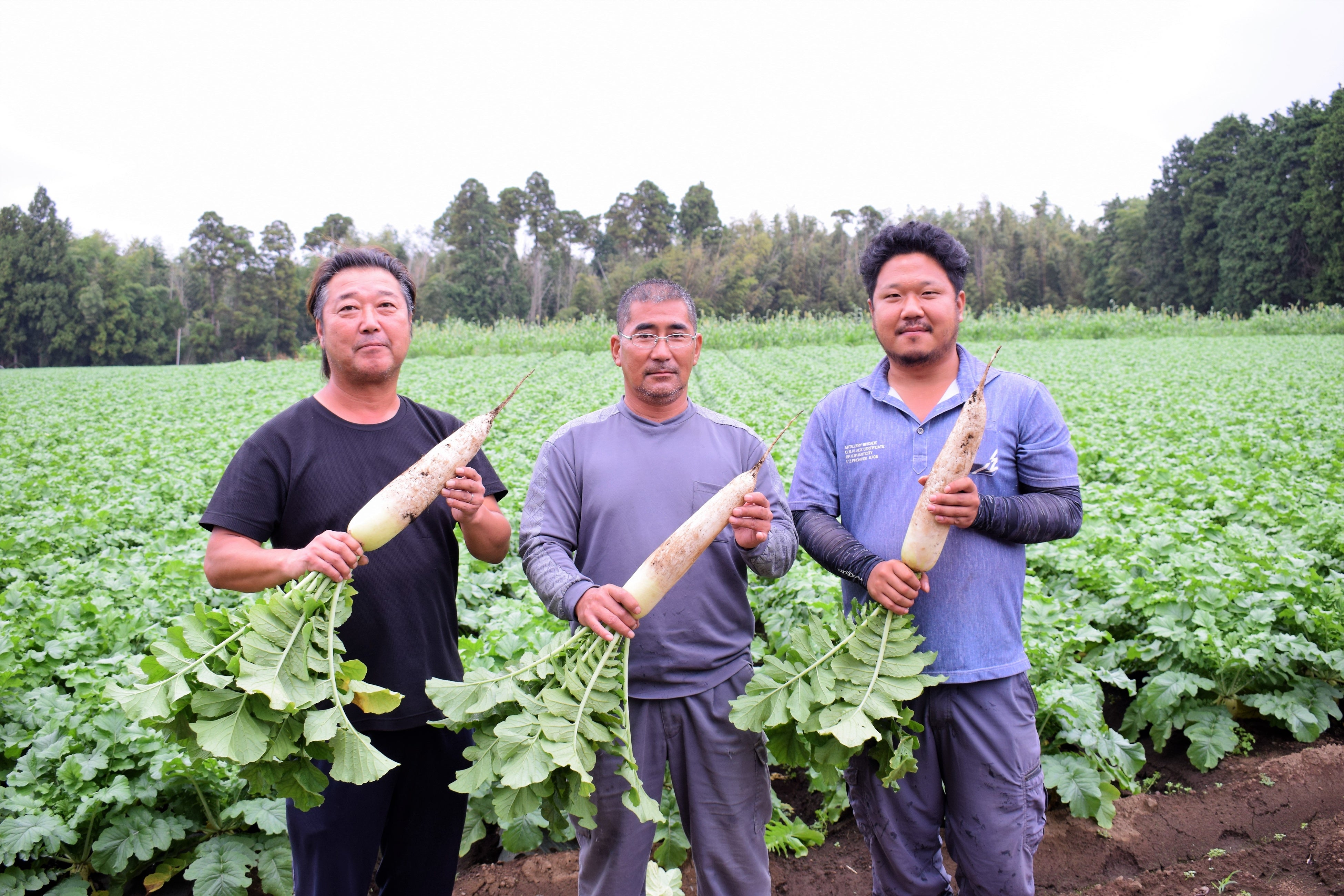 千葉県市原市の特産である姉崎だいこんの生産地は、冬には霜が降りるほど寒さの厳しい地域です。寒さの中でゆっくりと生育する大根は、甘みと水分を蓄えながら柔らかく育ちます。みずみずしい食感と、芯まで白いといわれる鮮やかな白さが特徴です。収穫は10月から翌年5月末まで行われます。