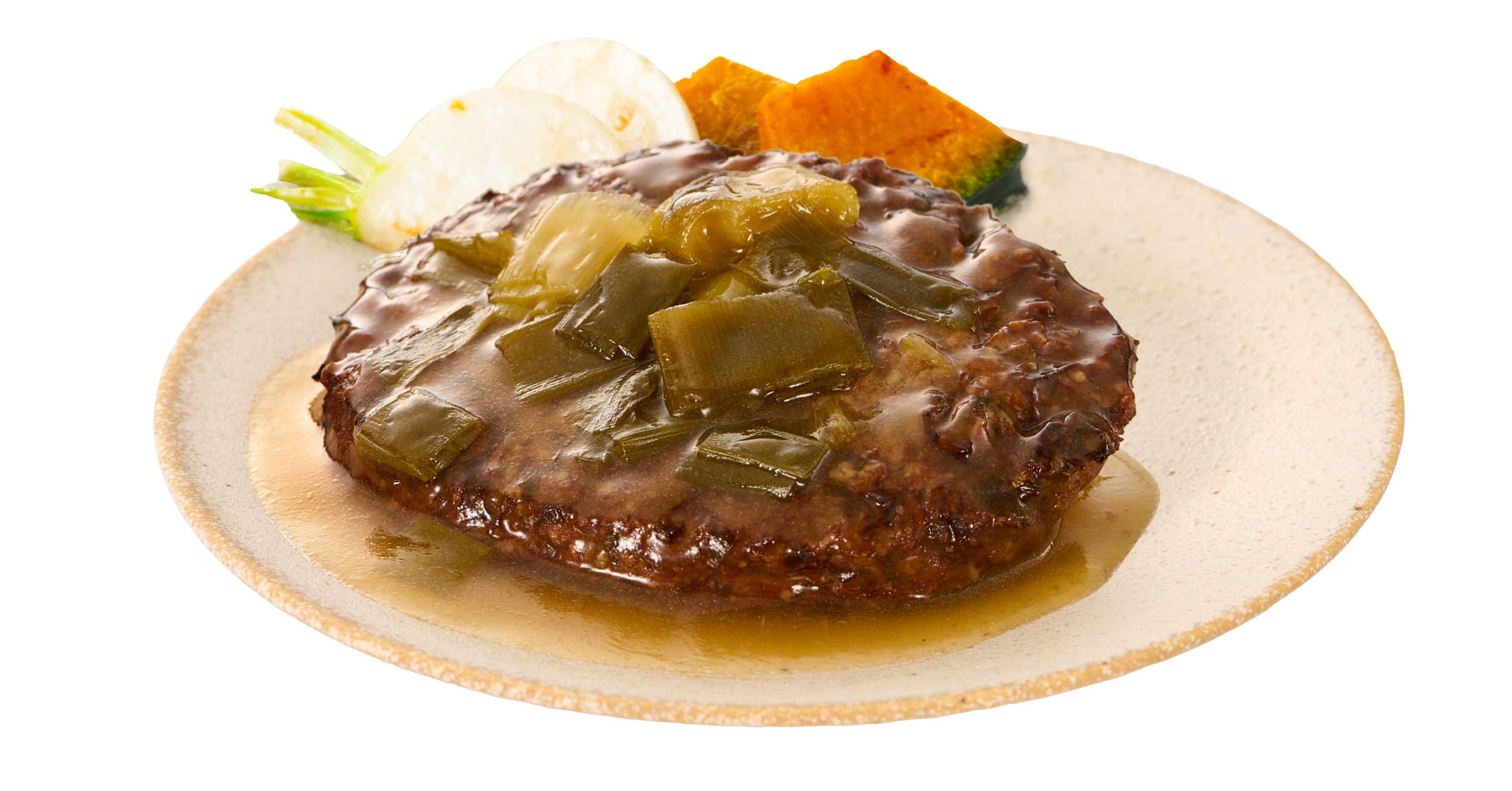 京の伝統野菜・九条ねぎをソースとパティの両方に使用したハンバーグです。ねぎ本来の甘みと香りをいかし、お箸でも簡単に切れるほど、ふっくらとやわらかく仕上げました。ソースの調味料には、地元・京都亀岡の竹岡醤油を使用し、コクと甘みのある和風しょうゆ味に仕立てています。