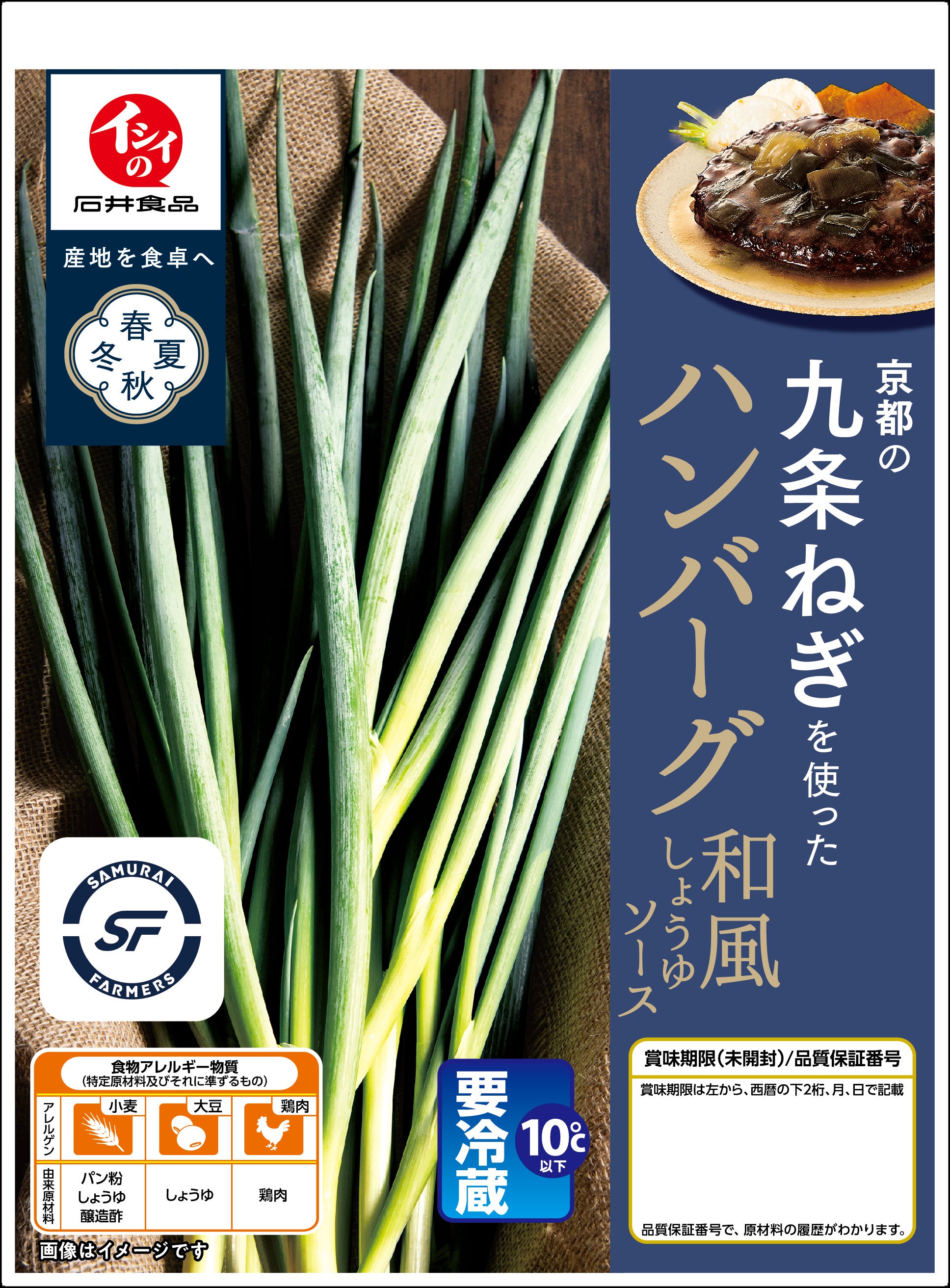 京の伝統野菜「九条ねぎ」の生産者グループである SAMURAI FARMERS とともに、京都の九条ねぎを使ったハンバーグの商品開発を進めました。九条ねぎ市場は生産と流通の分業が進み、小規模生産者が多いため、一年を通した安定的な収穫・流通が難しいという課題を抱えています。この課題に対し、安定供給に必要な収穫量の確保や、産地分散による自然災害リスクの軽減を目指して、同じ志を持つ若手農家3名が立ち上げたのが SAMURAI FARMERS です。石井食品はこの取り組みに共感し、九条ねぎを通じた地域連携と持続可能な農業の実現を目指しています。