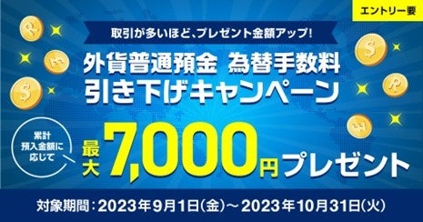 キャンペーン名 | 外貨普通預金 為替手数料引き下げキャンペーン 累計預入金額に応じて最大7,000円プレゼント |
