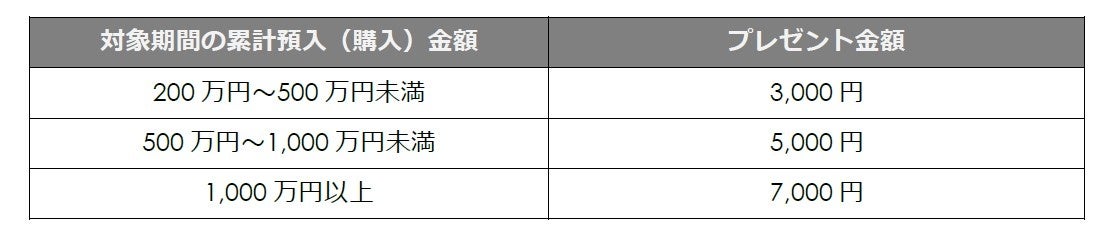 条件 | 対象期間中に以下すべての条件を満たしたお客さま ・本キャンペーンにエントリーいただくこと ・預入金額10万円以上が1回以上あること ・累計預入金額が200万円以上あること ※ 全通貨の預入金額が対象です。 ※ 対象期間中に1回の取引で10万円以上の新規預入があれば、対象期間中のすべての 預入金額を合算した金額が対象となります。 |