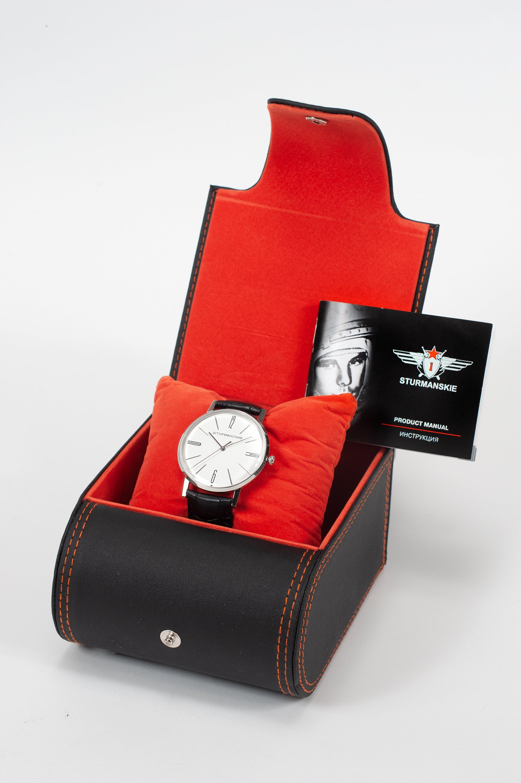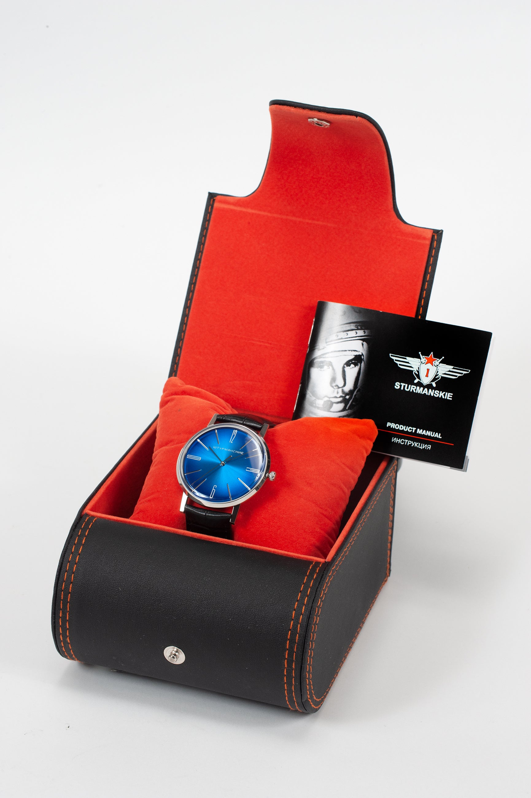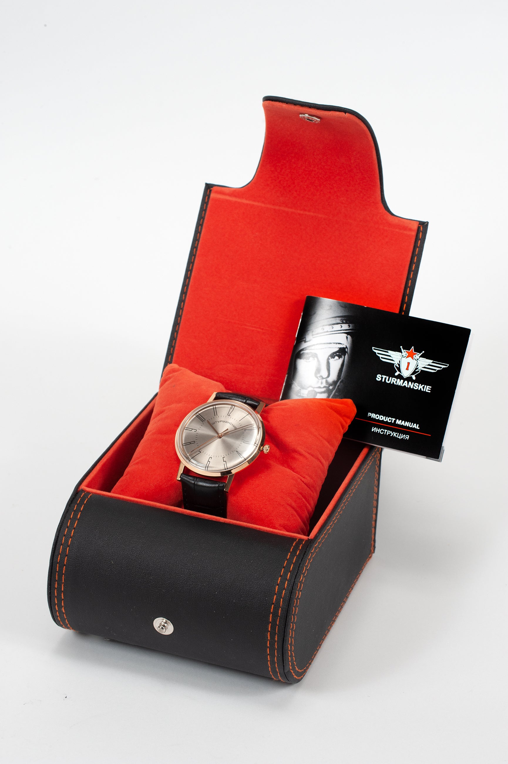 初期モデルは、第一モスクワ時計工場製のケースに収められ、ゴールドメッキのラウンドケース、ダイヤモンド加工のベゼルとケースリングを備えていました。