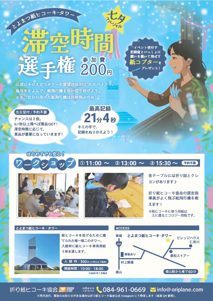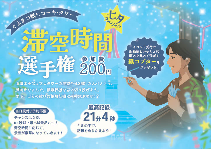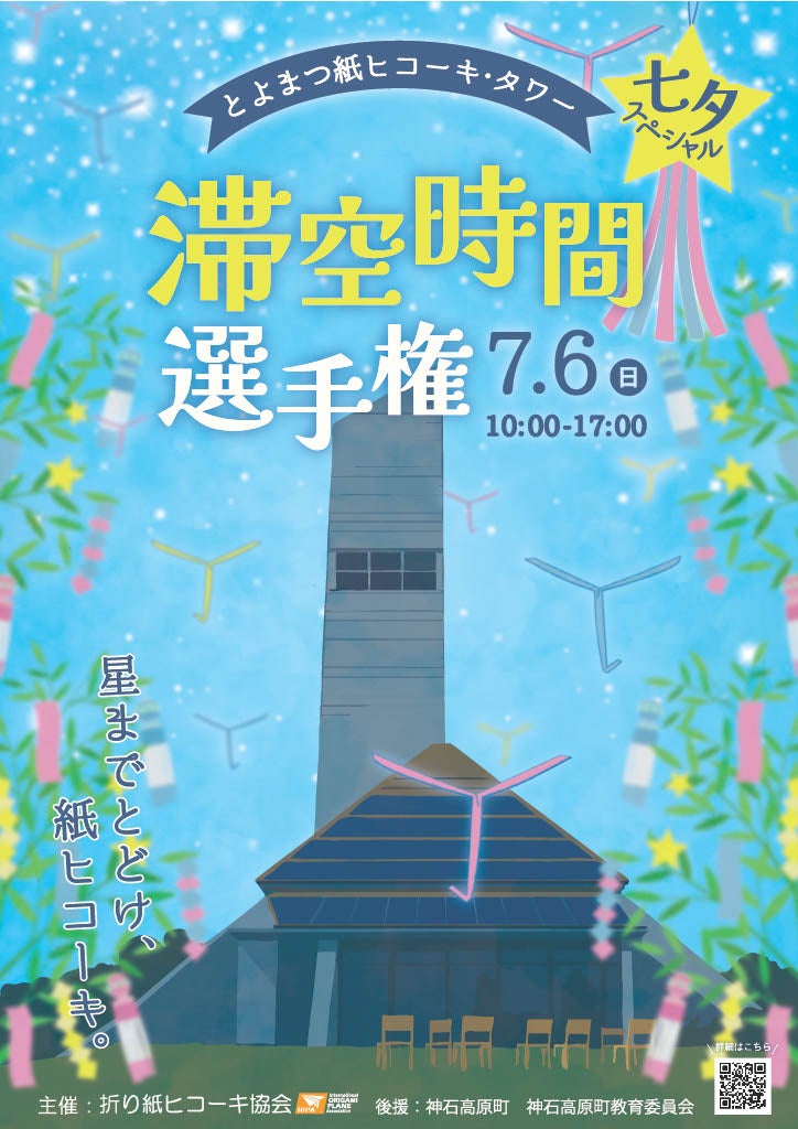 折り紙ヒコーキ協会(広島県福山市、戸田拓夫会長)は、折り紙ヒコーキの滞空時間チャレンジイベント「滞空時間選手権 七夕スペシャル」を7月6日(日)、広島県神石高原町のとよまつ紙ヒコーキ・タワーで開催します。とっておきの紙ヒコーキと、願いを込めた「紙コプター」を大空に飛ばしませんか?