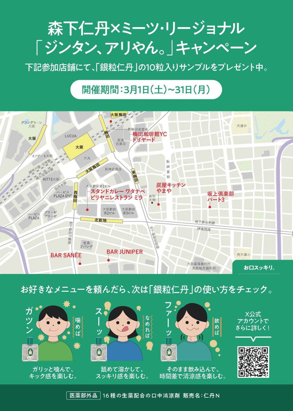 「Meets Regional 」4月号「梅田で飲みたい!」は、毎年恒例の梅田特集号。そこで、「銀粒仁丹」と梅田エリアの飲食店8店でコラボし、サンプリングイベントを実施します。