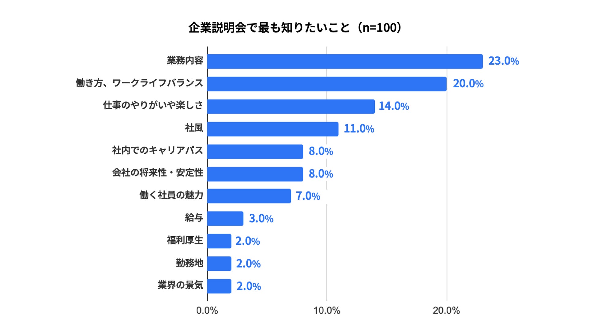企業説明会で最も知りたいことは「業務内容」(23.0%)が最多で、次いで「働き方・ワークライフバランス」(20.0%)、「仕事のやりがいや楽しさ」(14.0%)の順となりました。実際に自身が働くことを前提とした項目で見ると、現時点では「社風」や「社内でのキャリアパス」よりも「働き方・ワークライフバランス」に重きを置いている様子が見られました。