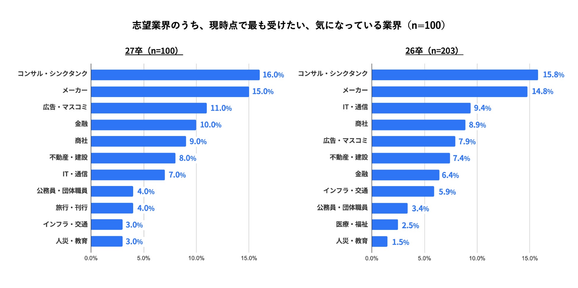 志望業界を尋ねたところ、1位が「コンサル・シンクタンク」(16.0%)、次いで「メーカー」(15.0%)の順となりました。昨年の2026年卒学生への調査も同様の結果であることから、両業界の根強い人気が浮き彫りとなりました。また同調査の結果と比較すると「金融」が3.6pt、「広告・マスコミ」が3.1pt上昇した一方、「IT・通信」が2.4pt減少しました。