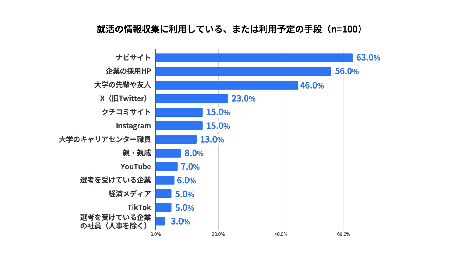 就活情報の収集手段は「ナビサイト」(63.0%)、「企業の採用HP」(56.0%)、「大学の先輩や友人」(46.0%)の順となりました。また「X」(23.0%)や「クチコミサイト」「Instagram」(ともに15.0%)も一定の支持を獲得しています。企業主体で発信されるコンテンツだけでなく、自分と同じ立場(同級生や就活を経験した先輩)の人たちのクチコミも合わせて参考にしていると考えられます。