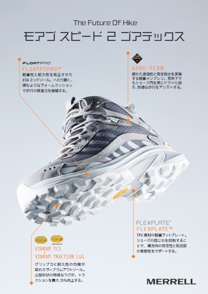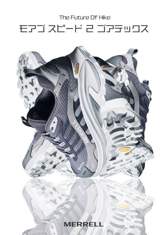 MERRELLでは、トップセラーアイテムこそ消費者インサイトを蓄積し、ユーザーメリットとなる改善点を早期に洗い出すことに注力しており、その中で「フィット・安定性・トラクション・デザイン」への改善点を見出し革新的アップデートに辿り着き今季登場となったシューズが、「MOAB SPEED 2 GORE-TEX®」です。当製品は、オリジナルモデルのアッパー構造で見られたブレ感を修正すべく、アッパーデザインから素材を一から見直し、フィットの改善を施しました。また、従来モデルに対しミッドソールを6mm厚くし、フォームミッドソールの質量を30%増加させたことで、反発弾性に優れたクッション性の増幅と共に歩行安定性に対して革新的な違いを生み出しました。更にアウトソールは、”MERRELL TEST LAB”の「ROGUE HIKER」より着想を得て、ラグの高さから配置まで再考しフルリニューアル。業界随一のグリップを誇るVibram社製のMERRELL専用ソール”Vibram TC5+”に”Traction Lug”を組み合わせることで、フィールドで確かなパフォーマンスを発揮するシューズへと変貌を遂げました。急な悪天候をものともしない、GORE-TEX®メンブレンも完備することで、快適性の追求に対して一切の妥協はありません。