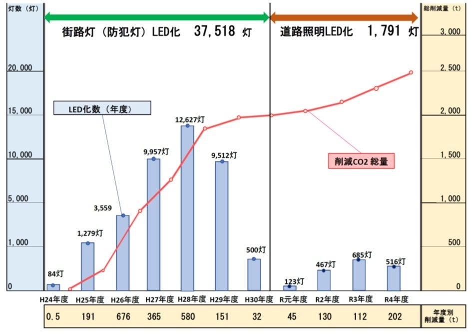 ▷街路灯(防犯灯タイプ)はH24~H30年度まで実施し37,518灯を交換。
