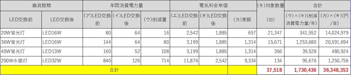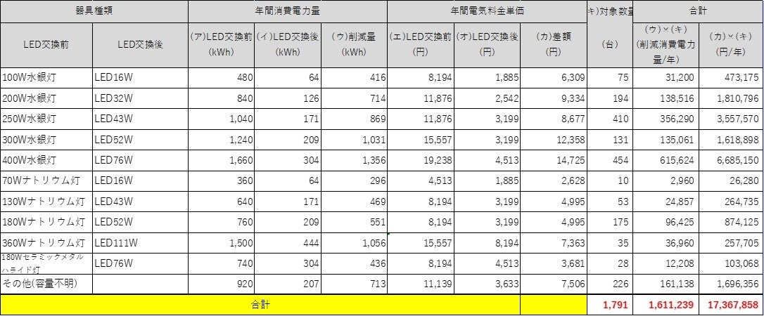 ・その他(容量不明)の電気代削減額は100W水銀灯~180Wセラメタ灯の平均額としている。