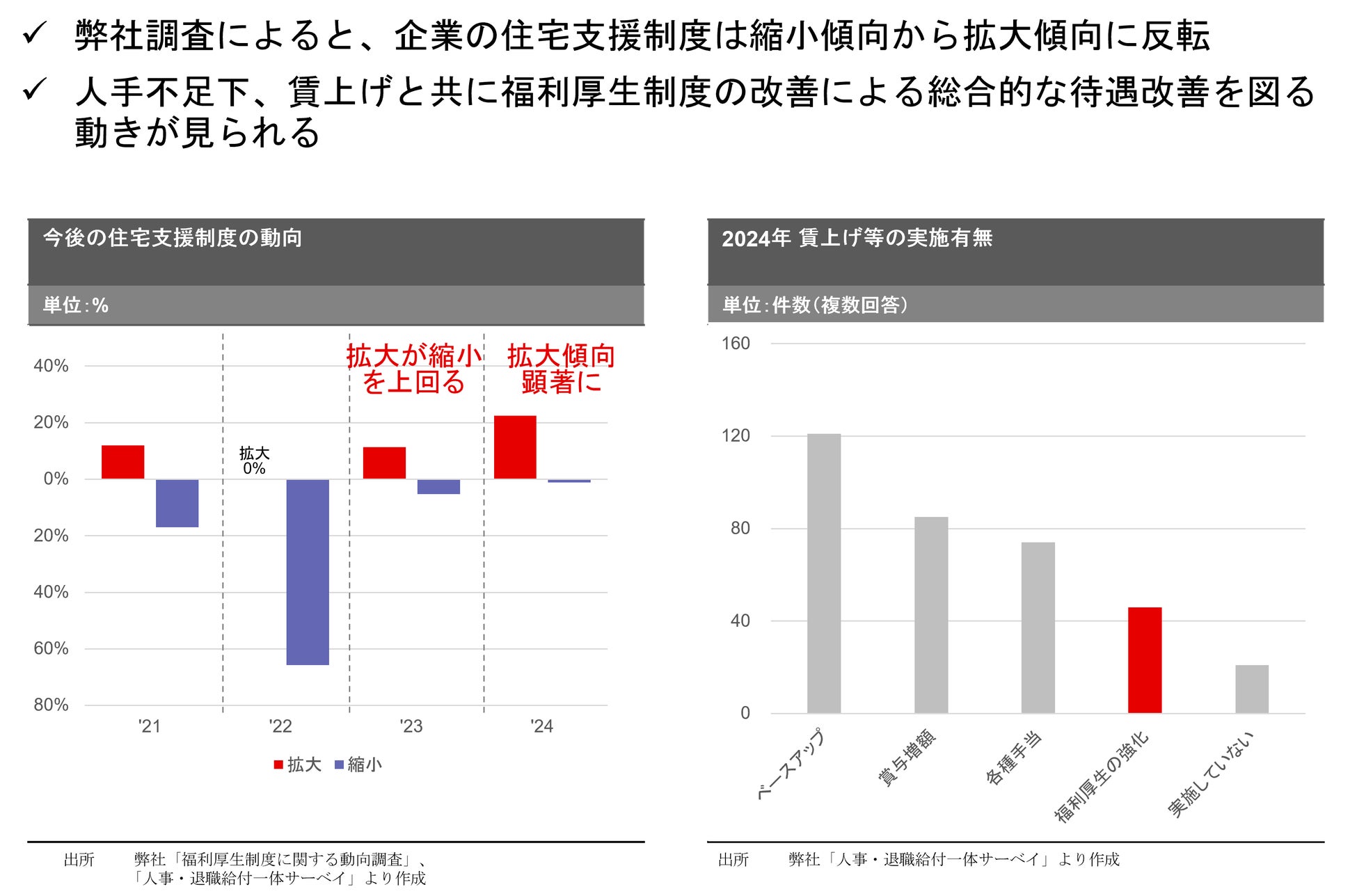 人手不足下、賃上げと共に福利厚生制度の改善による総合的な待遇改善を図る動きが見られる