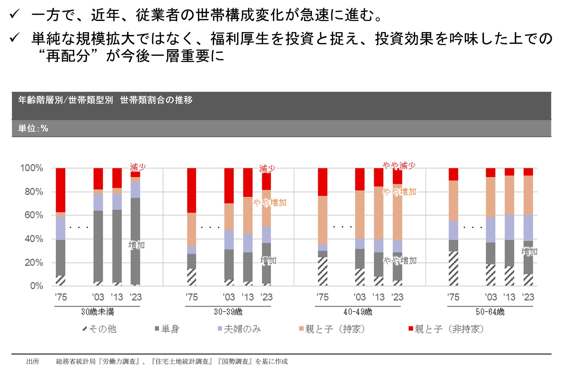 一方で、近年、従業者の世帯構成変化が急速に進む。単純な規模拡大ではなく、福利厚生を投資と捉え、投資効果を吟味した上での“再配分”が今後一層重要に