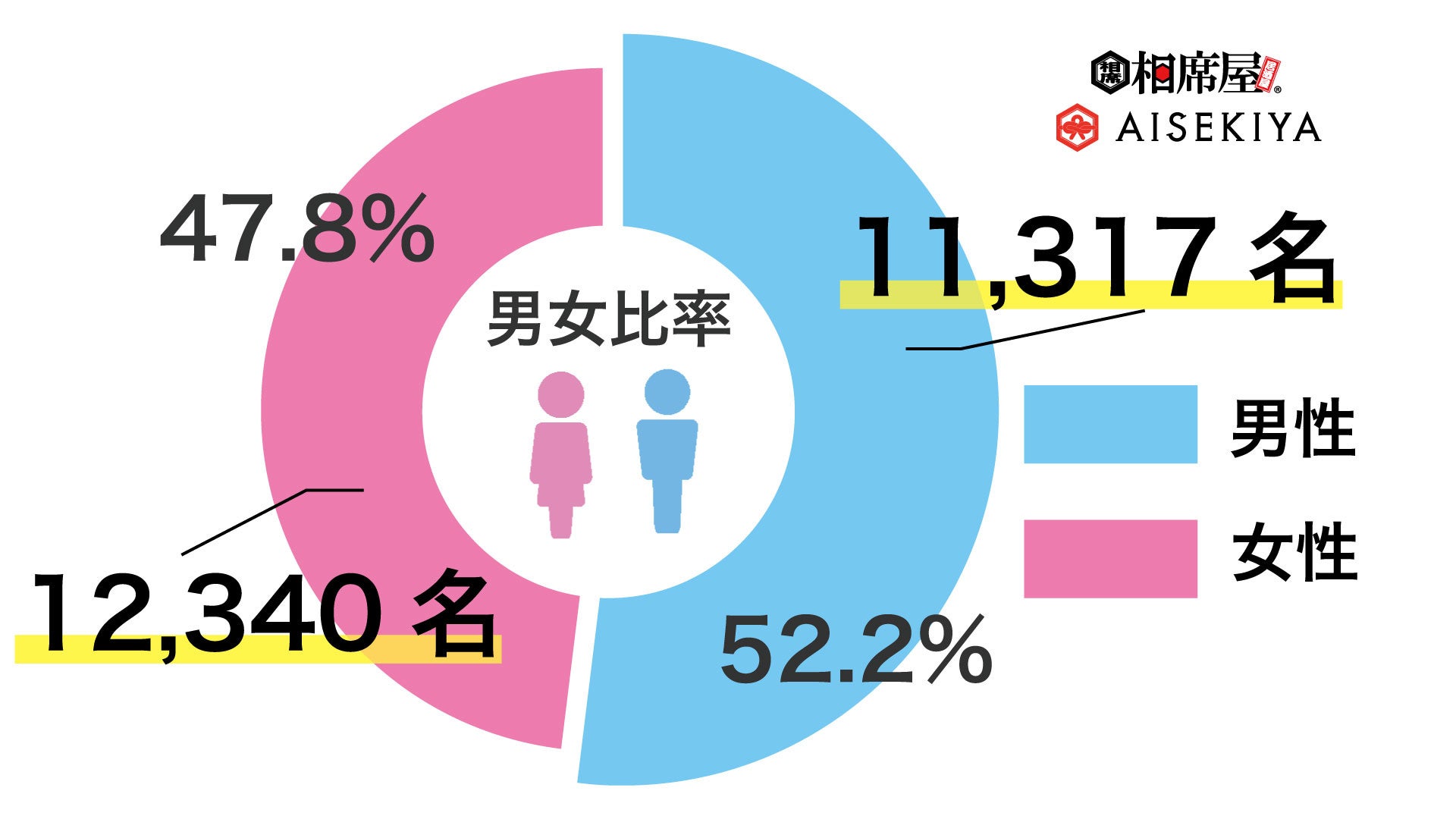 2024年4月の相席屋への男性来店数は11,317人、女性来店数は12,340人を突破。男性47.8%、女性52.2%でした。また、男性来店数のうち初めて来店した男性は3,027人、2回以上来店した男性は8,290人、⼥性来店数のうち初めて来店した⼥性は3,398⼈、2回以上来店した⼥性は8,942⼈でした。