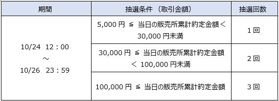 ・抽選条件の取引金額については実際の取引金額に準じます。