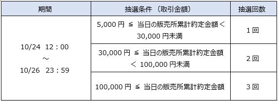 キャンペーン期間中、当日の販売所累計取引金額に応じて抽選に参加できます(獲得した抽選回数は当日のみ抽選可能)。