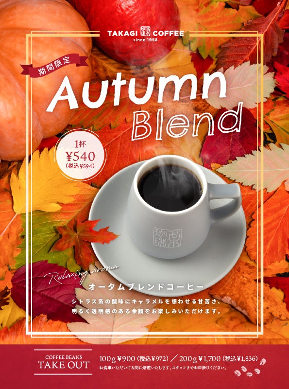 夏の暑さで疲れた心と身体を、香りで癒していただけるブレンドコーヒー「TAKAGIブレンド オータムブレンド」を期間限定でご用意いたしました。