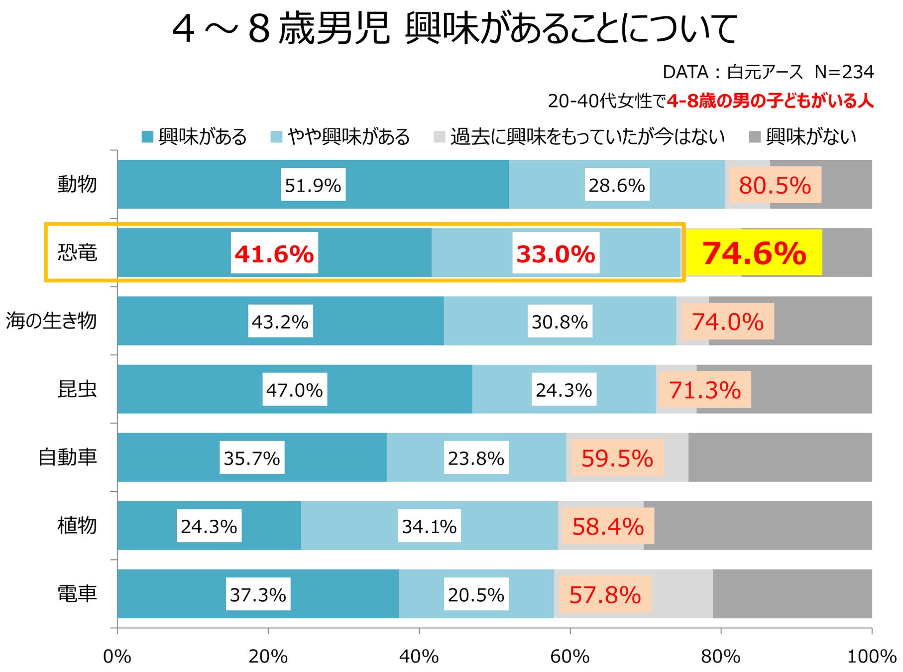 「てづくり入浴剤」は、材料をまぜて、もんで、かためるだけで、炭酸ガスの入浴剤が簡単に作れて、お子様とのおうち時間に一緒に楽しめる商品として好評をいただいています。今回当社が独自に調査したところ、年中から小学校低学年の男児は恐竜への関心が高いことが分かりました(下図参照)。