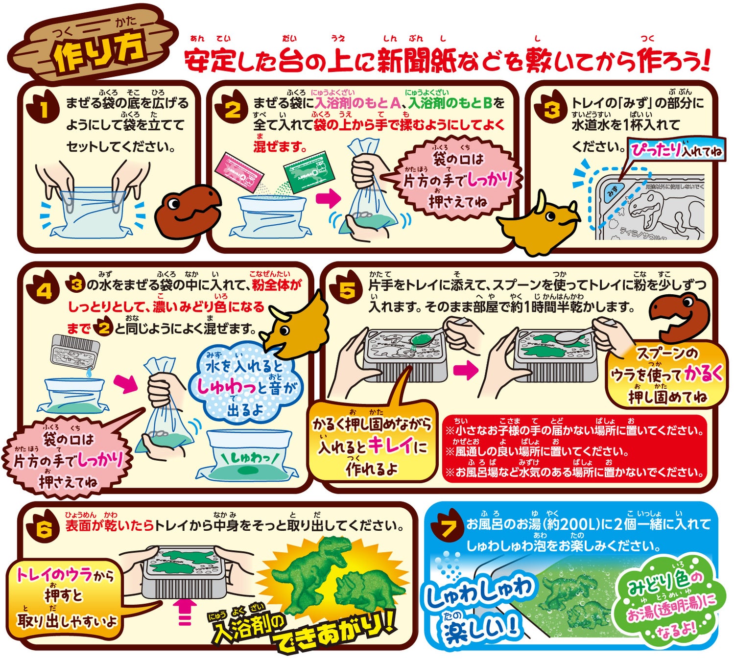 ●材料をまぜて、もんで、かためるだけで、ティラノサウルスとトリケラトプスの入浴剤が簡単に作れます。