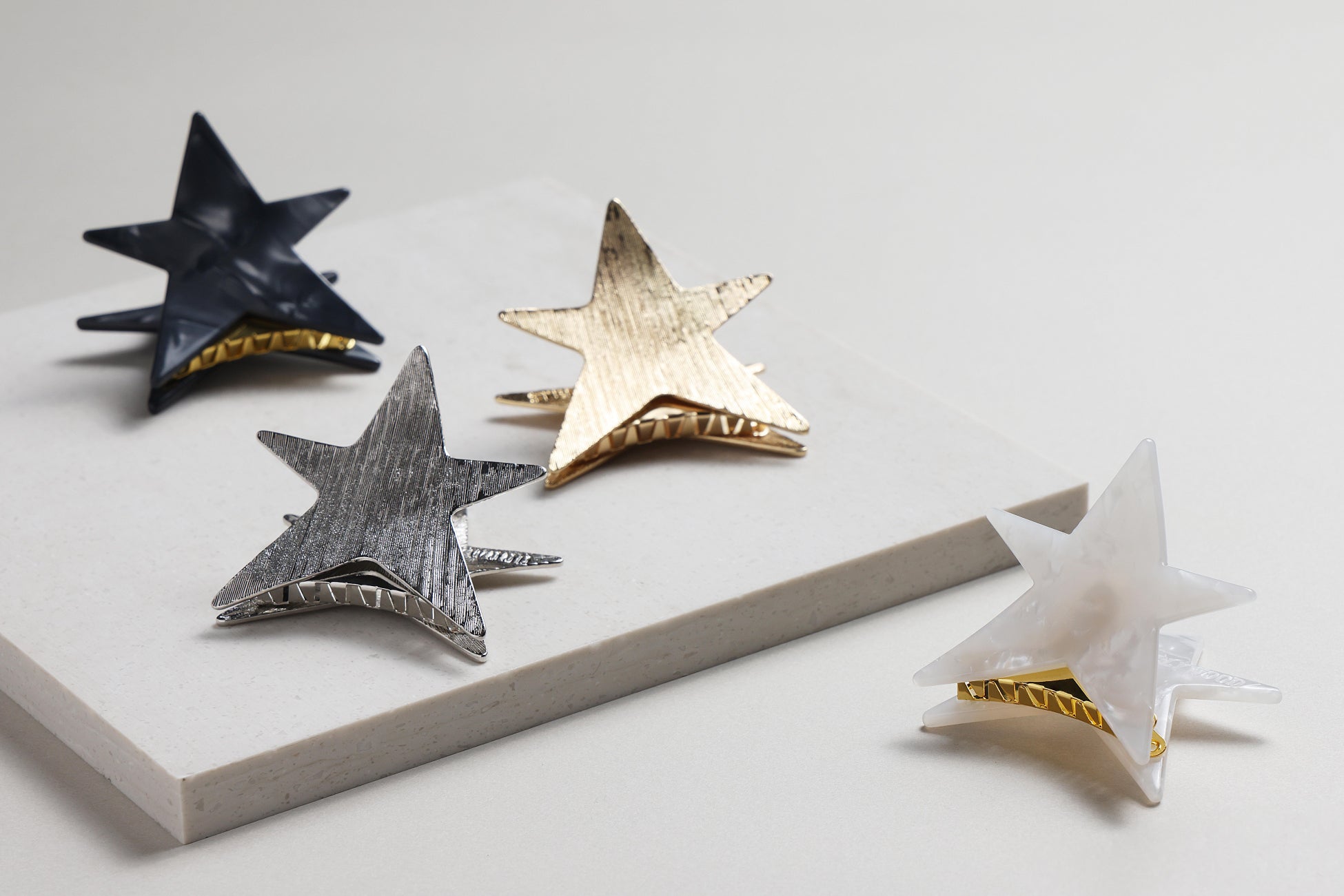 マーブル模様やメタルなど、それぞれ印象の違うスターバンスは、ヘアアレンジにさりげない華やかさをプラス。ラフにまとめた髪に添えるだけで、スタイリングを引き立てるワンポイントとしてお楽しみいただけます。