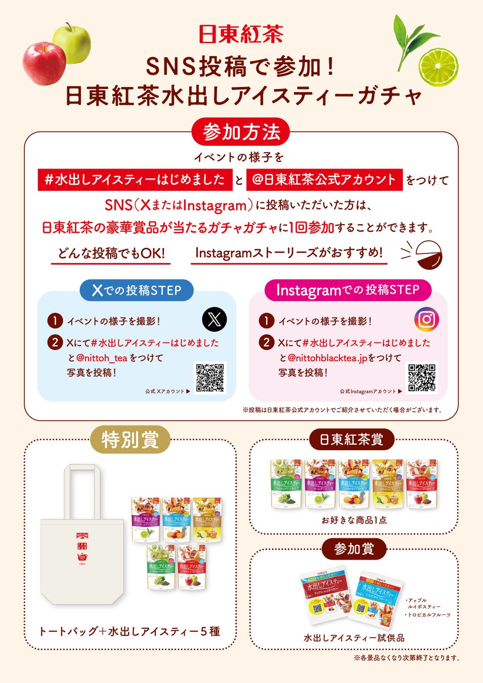 「@日東紅茶公式アカウント」をつけてイベントの様子をSNS投稿いただいた方は、日東紅茶の商品が当たる「水出しアイスティーガチャ」にチャレンジいただけます。