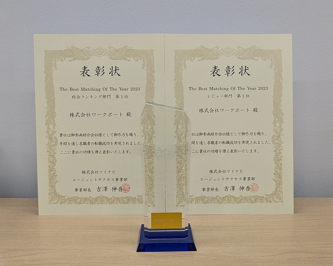 総合転職エージェントの株式会社ワークポート(本社所在地:東京都品川区、代表取締役社長COO:林 徹郎)は、この度株式会社マイナビが主催するマイナビ転職エージェントサーチ『The Best Matching Of The Year 2023』の総合ランキング部門第1位、レビュー部門第1位を受賞いたしましたことをお知らせします。