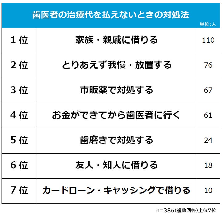 ・歯医者の治療費を払えないときの対処法1位は「家族・親戚に借りる」
