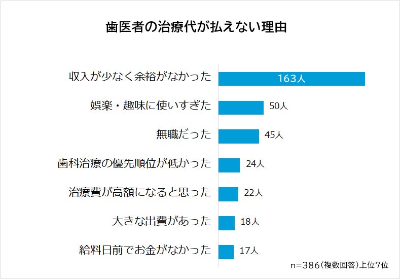 歯医者に行くお金がなかった経験をもつ386人に「歯医者の治療費が払えない理由」を聞きました。