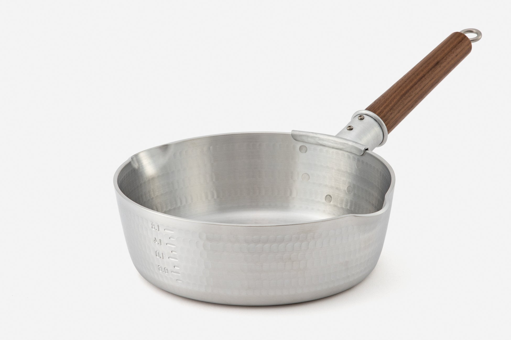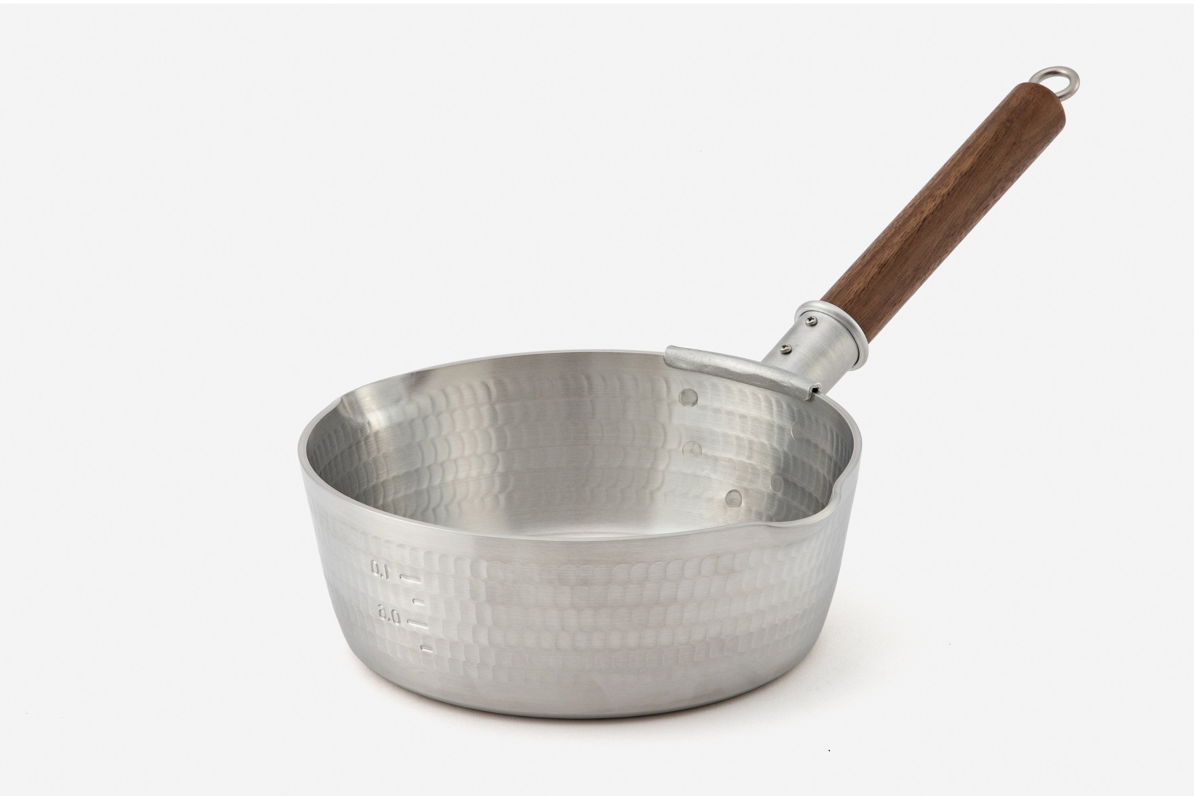 極厚の3mmアルミを使用するゆきひら鍋は、蓄熱がよく熱ムラが少ないため、使うだけで料理が美味しく仕上がる設計になっています。また「煮込む」「茹でる」といった調理方法に適しており、和洋中どんなジャンルの料理でも使いやすいアイテムに。底が広い浅型で具材を敷き詰めやすく、均等に火が周り煮崩れを防ぐ使い勝手の良い形状にもこだわりました。また、極厚でありながらも適度な重さで、持ちやすいのが特徴です。さらに、鍋の内側には計量の目盛りが付いているため、計量カップを使わずに水の量を測ることができるのも便利です。