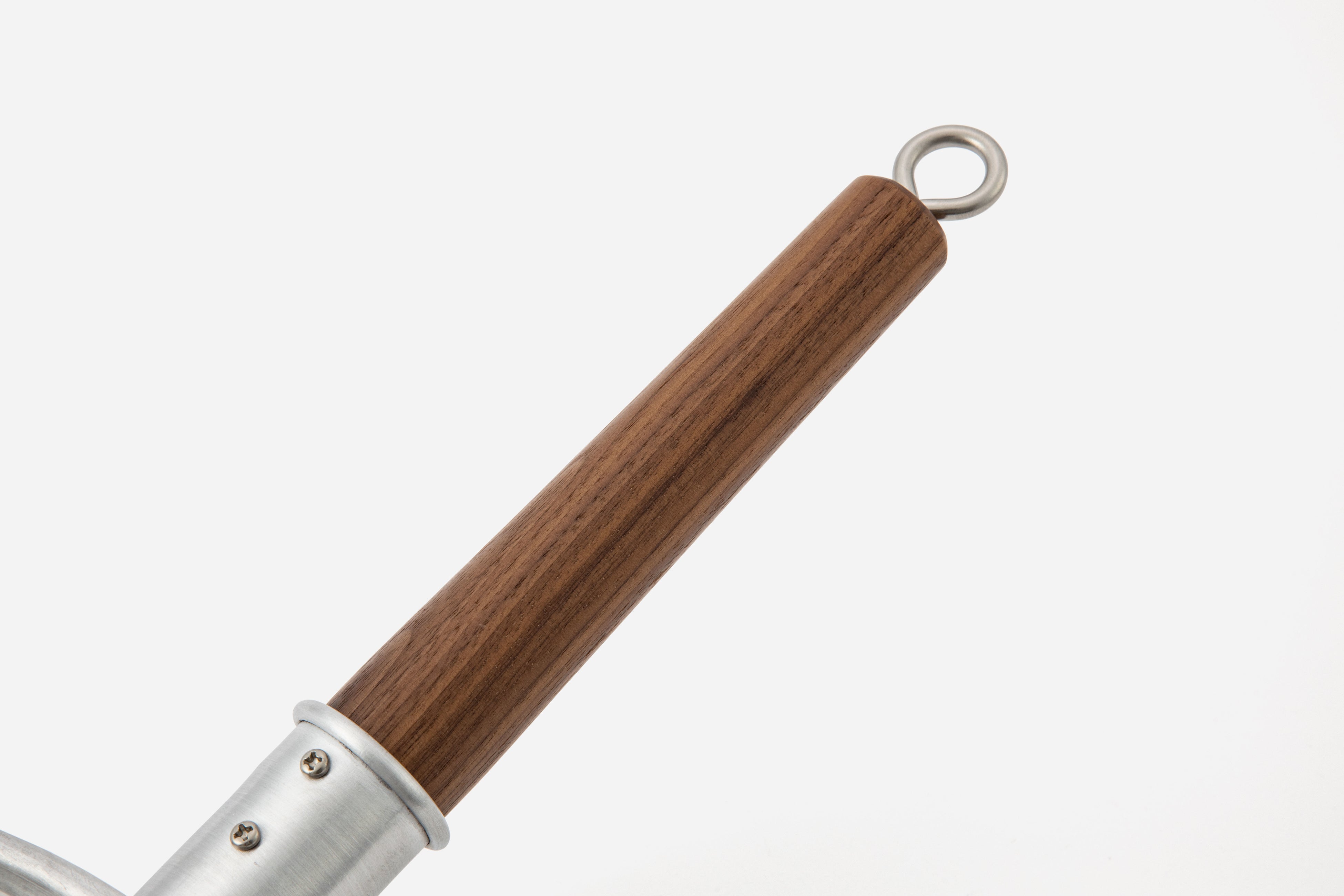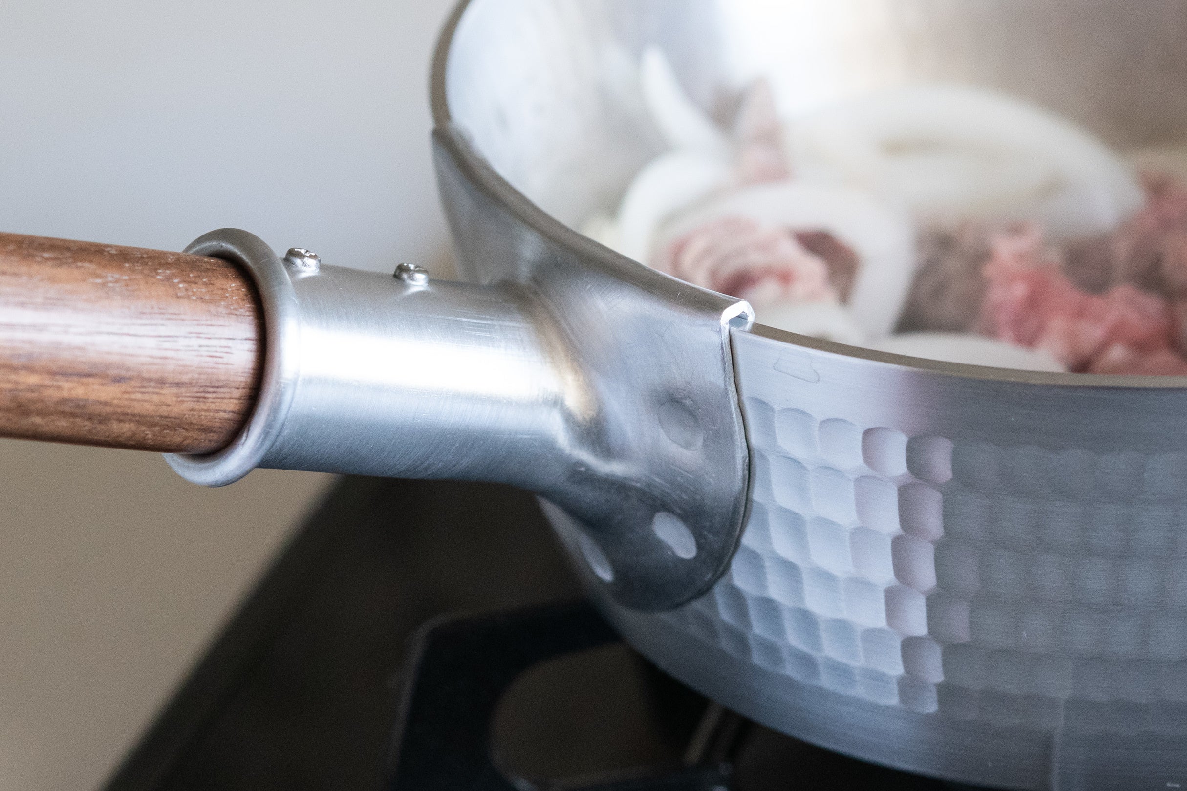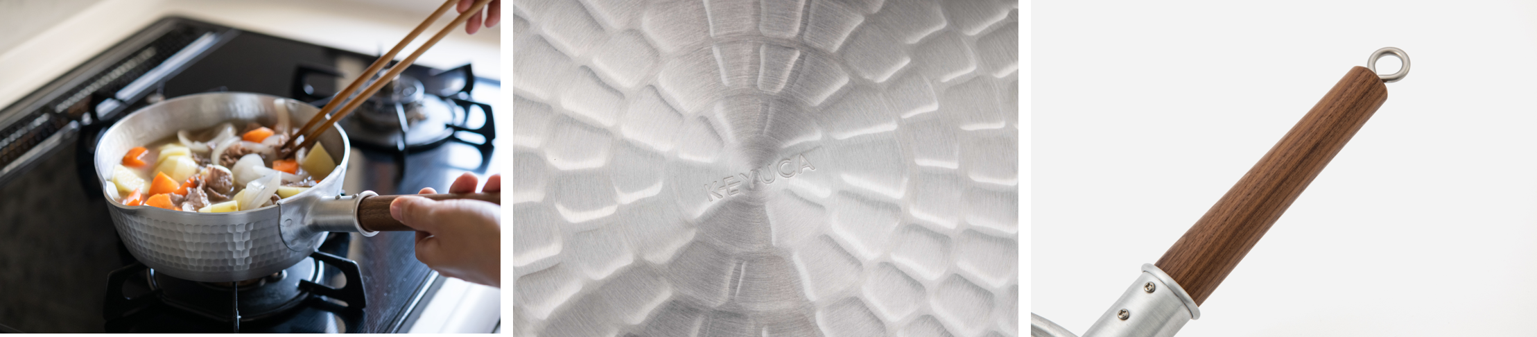 機能面だけではなく、毎日使うものだからこそ、高級感がありながらも日常に馴染みやすいデザインにこだわりました。耐久性向上のための槌目は美しく高級感のあるデザインに。またどんな料理にも、どんなキッチンにも合うように、取手にはこげ茶色のウォールナットの木材を使用し、「和」に寄りすぎない日常に溶け込むデザインに仕上げました。