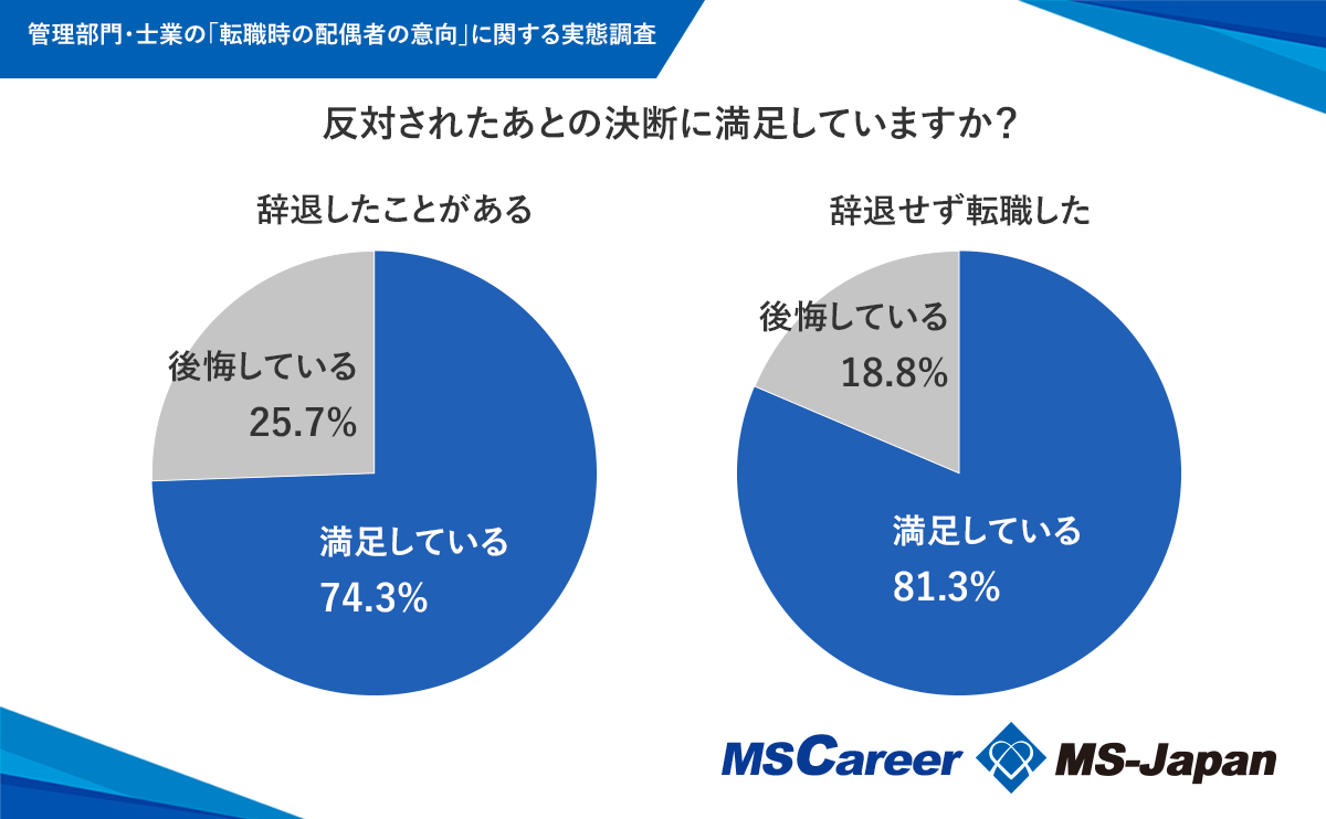 また、反対されたあとの決断に満足しているかどうかを調査すると、辞退したことがある人・辞退せずに転職した人ともに、7割以上が「満足している」と回答しました。