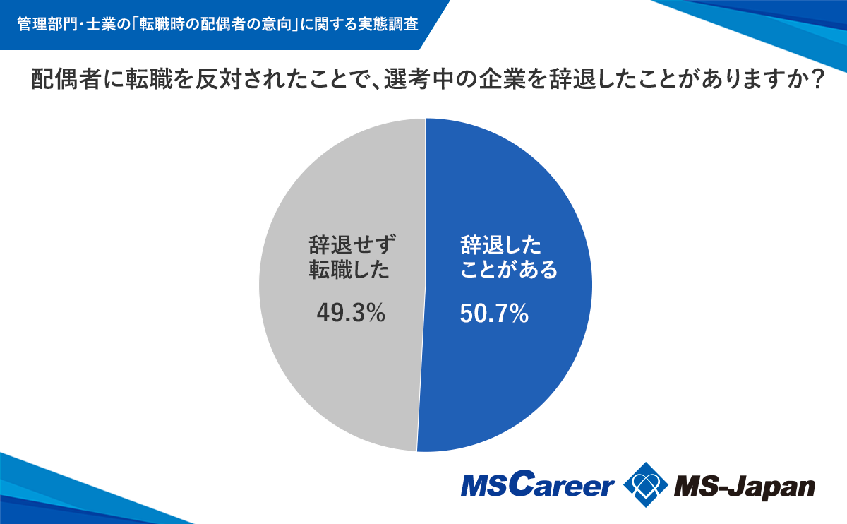 配偶者に転職を反対された人のうち、50.7%が選考中の企業を辞退していたことが分かりました。