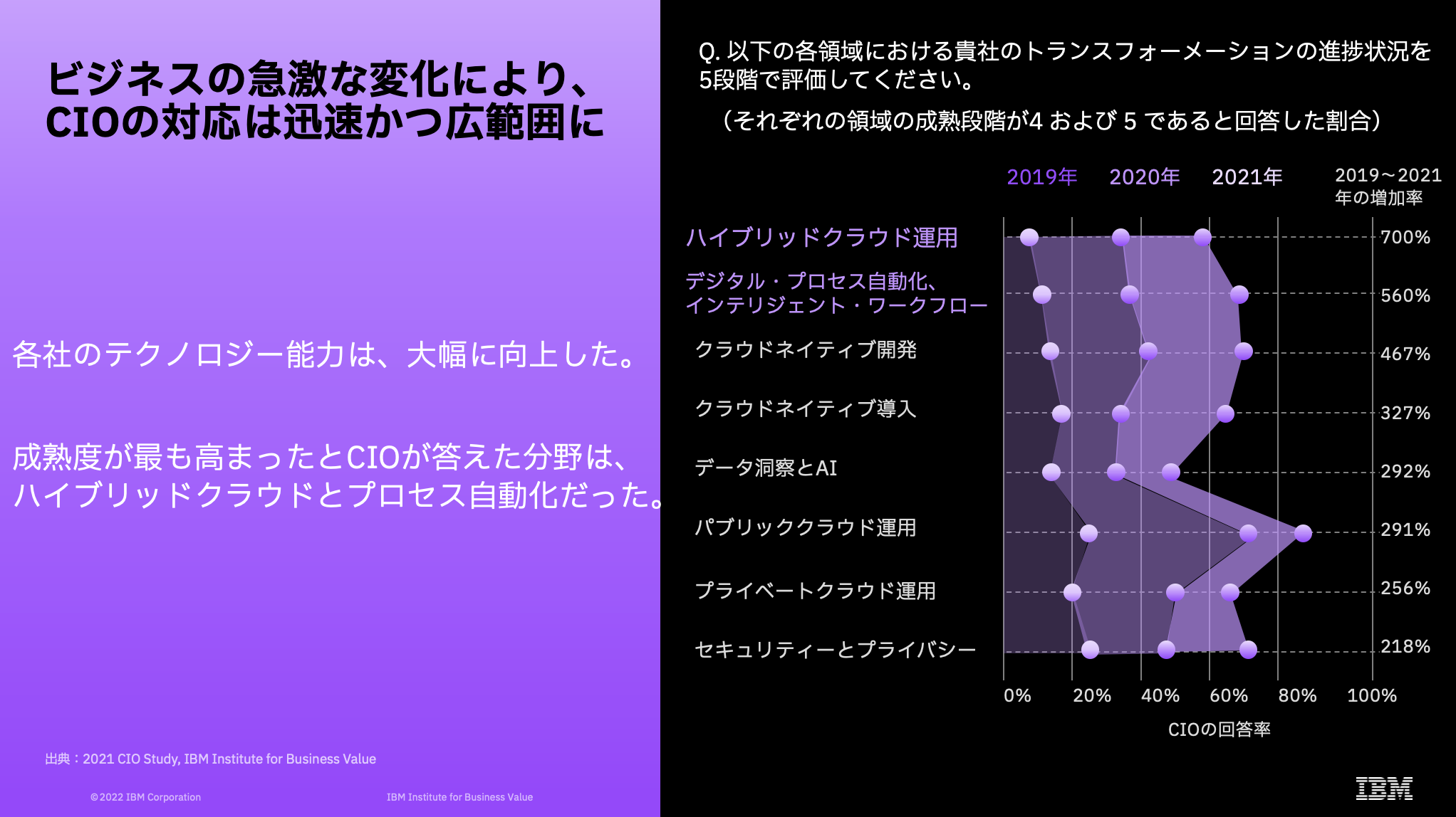 ハイブリッドクラウドは、AIを活用したインテリジェント・ワークフローを支える重要な基盤です。本調査によると、ハイブリッドクラウド運用の成熟度が向上したと回答したCIOの人数は、2019年と比べて700%増加しました。