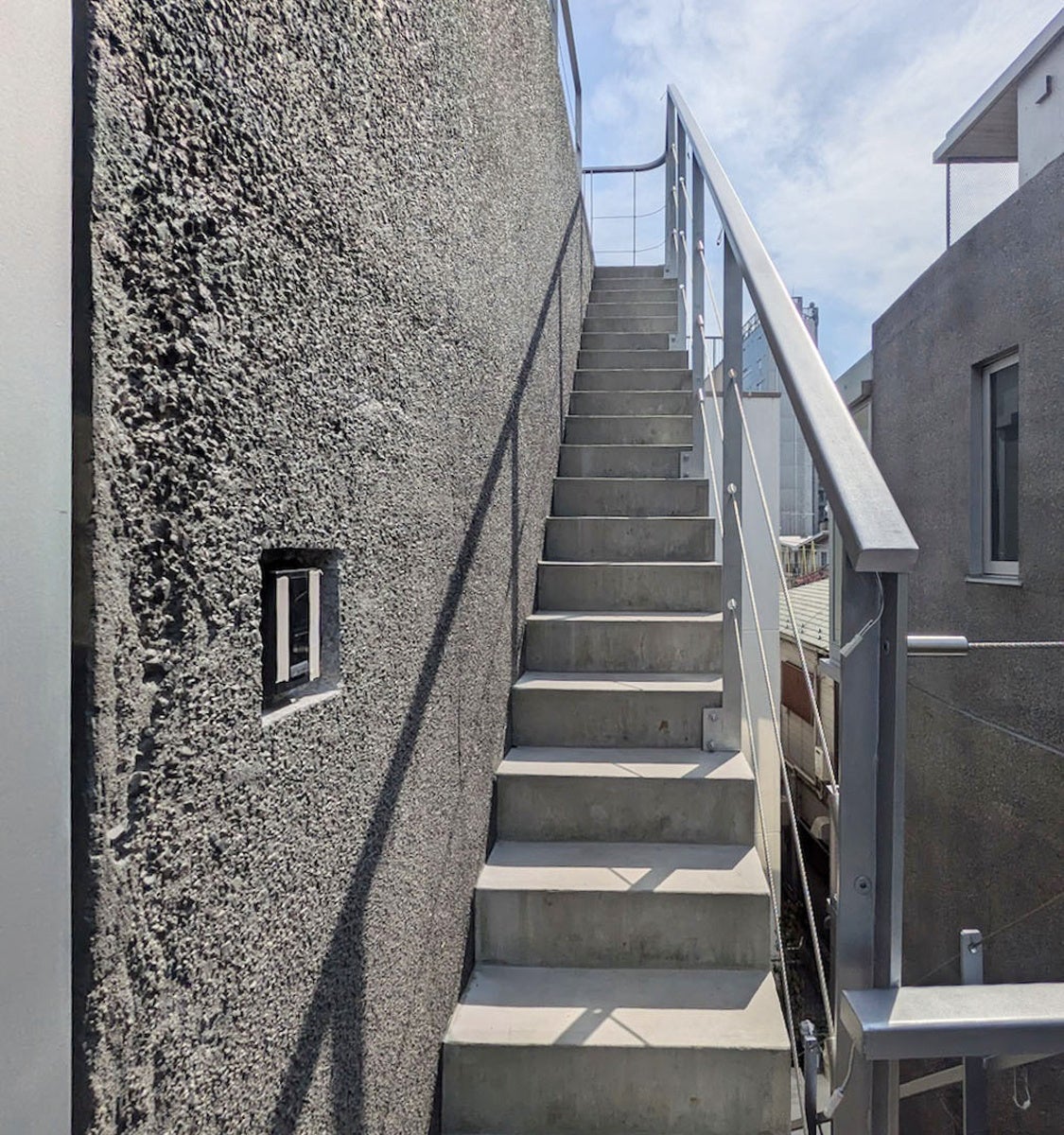 密集する住宅地、最小限の接道、北側敷地との大きな高低差など難しい条件の中、空間の有効面積を最大限に確保。ささやかに差し込む光と影がコンクリートに映し出すその表情は、季節の移ろいに応じて様々に変化します。
