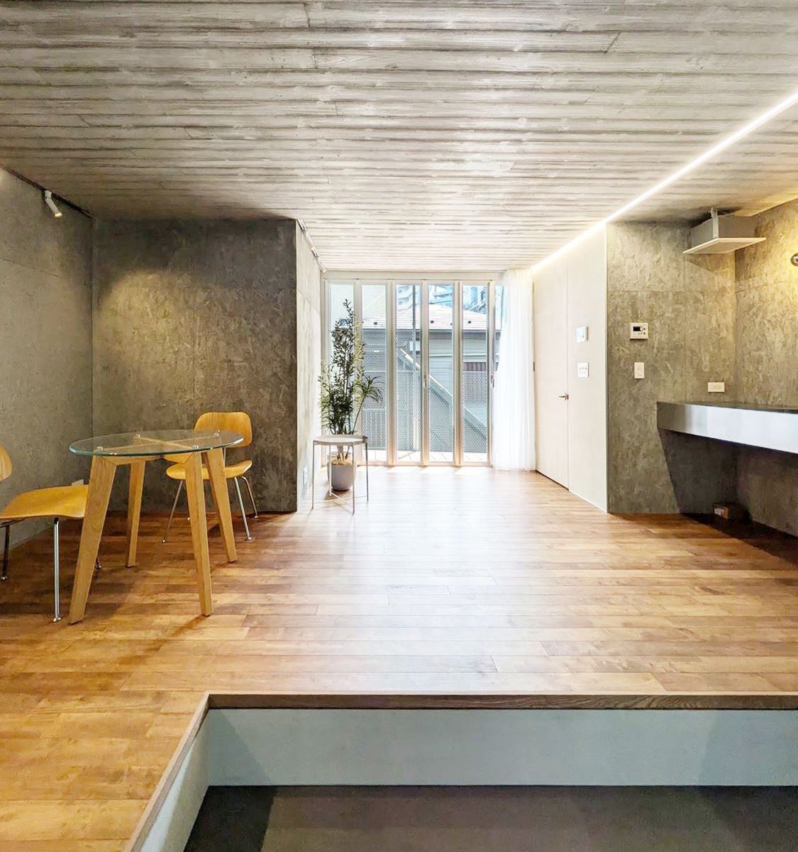 室内は床の段差により、コンパクトながらも異なる性格の空間を作りました。4種類の型枠を使い分けたコンクリート壁で、統一感がありながらも多様なテクスチャーを楽しむことができます。