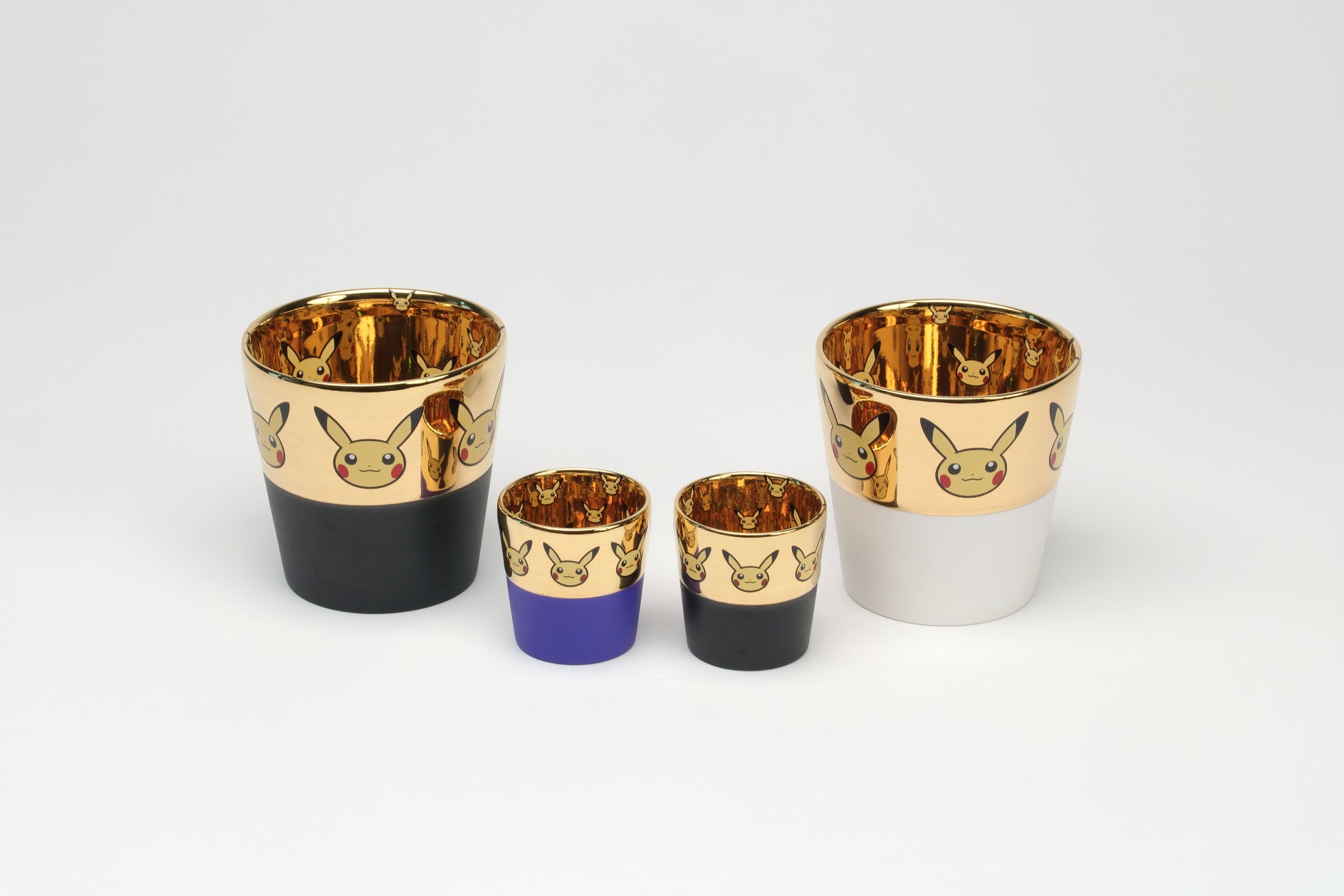 赤・黒・黄・桃・白・青などくっきり明るく鮮やかな色と、ゴールドやプラチナの釉薬のコントラストが美しいカップに、ピカチュウフェイスがたくさん配置されています。