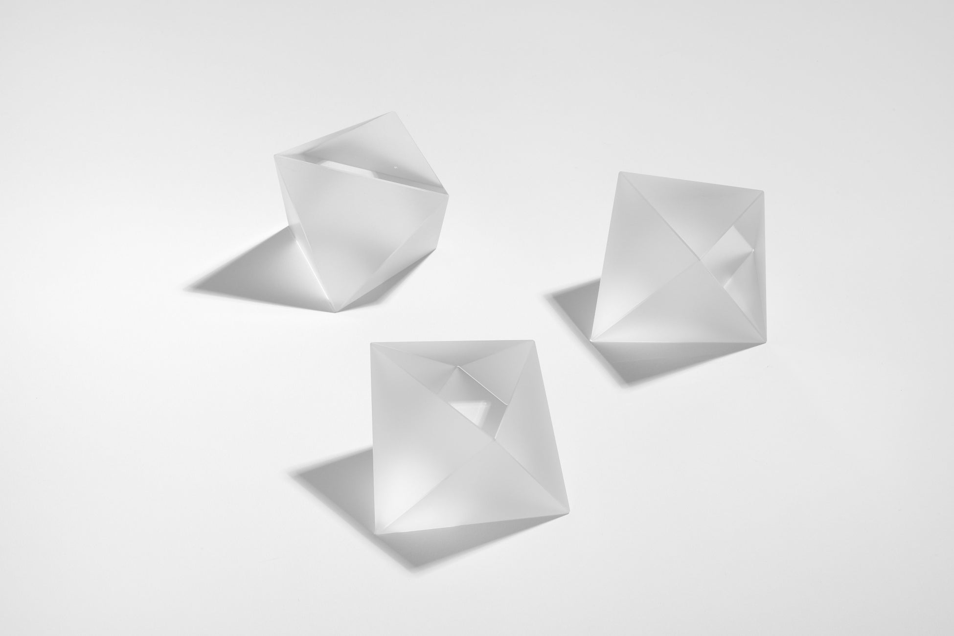 「つららおとし」のテーマに合わせて、作家本人がこのペーパーウェイトのために削りだした不規則な8面体を元に制作しました。ガラス製で重量感のある仕上がりのアイテムです。ガラスの表面はマットに仕上げられていますが、一面だけクリアに磨かれ、光を内包する形状になっています。