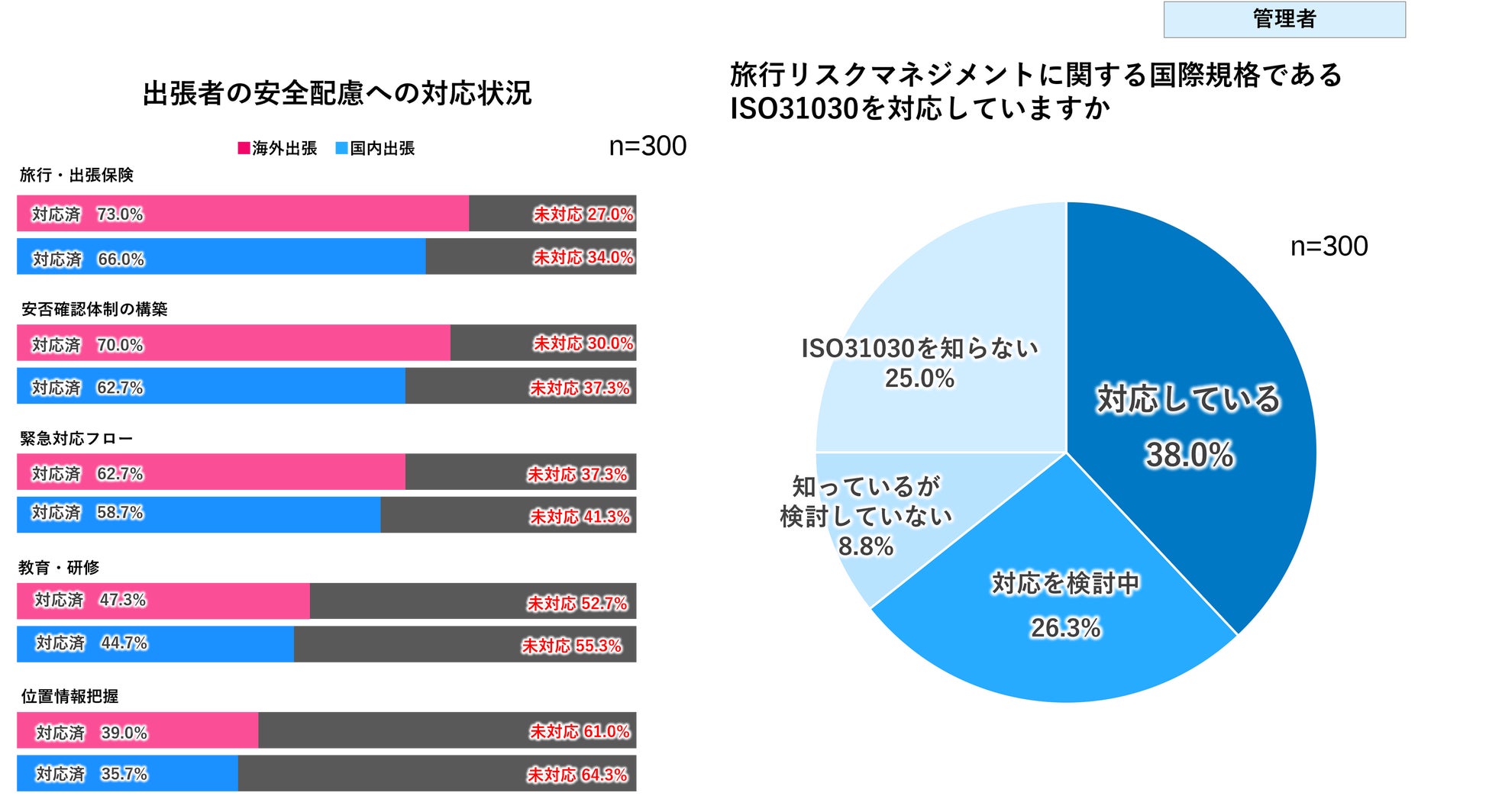 さらに、旅行リスクマネジメントに関する国際規格であるISO31030(国際標準化機構〔ISO〕が策定)に対応している企業は全体の38.0%にとどまりました。出張者の安全管理については本来、万全な体制が求められる領域であるにも関わらず、出張者の安全確保に向けた体制が十分に整っているとは言えない状況がうかがえます。