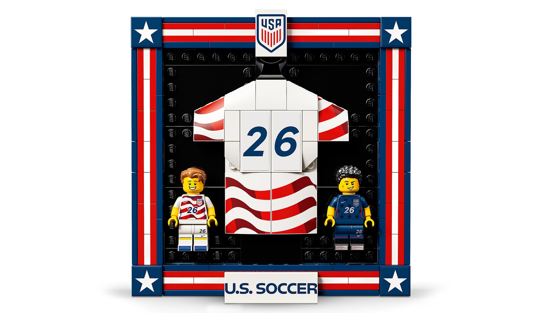 2026年アメリカ代表ユニフォームをモチーフにした本セットは、0から99まで背番号を自由にカスタマイズ可能で、レゴ®ミニフィギュアも2体付属しています。