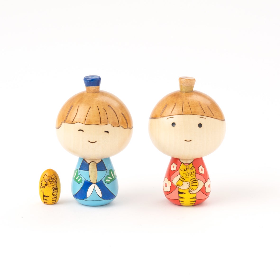 ペレの元となったのは、1964年〜1980年に作られたリサのオリジナル作品「ラーソン家の子どもたちシリーズ」のペレ(ペッレ)。そして、スティナの元となったのは、同じくリサのオリジナル作品「ねこを抱くスティーナ」。スティナは1957年に試作としてリサのアトリエで作られ、翌年には早くも製品化が実現した作品でした。オリジナル作品の朗らかな印象はそのままに、お内裏様(おだいりさま)とお雛様(おひなさま)になったペレとスティナ。桃の節句に合わせて、ひとつ成長した姿を見せてくれています。今回の作品も、これまでにリサのこけしをいくつも手掛けてきた群馬県の創作こけし工房と一緒に作りました。リサの原型を元に、こけし職人さん自身がデザイナーとなって作品をこけし向けに作り直す、というところから始まるなんとも奥深いこけし作り。手作りならではの木のぬくもりと細かな装飾の煌びやかさを同時にお楽しみいただける、お祝いにぴったりのとっておきが完成しました。