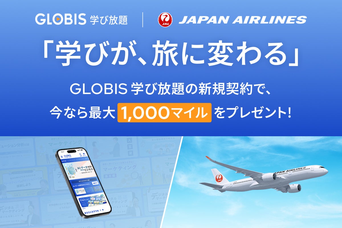 株式会社グロービス(本社:東京都千代田区、代表取締役:堀義人、以下 グロービス)が提供する定額制動画学習サービス「GLOBIS 学び放題」は、日本航空株式会社(本社:東京都品川区、代表取締役社長:鳥取三津子、以下 JAL)が運営するJAL会員向けマイル提携サービス「JALマイレージパーク」と連携を開始します。「GLOBIS 学び放題」の新規契約者を対象に、最大1,000マイルをプレゼントすることで、学び始めを応援するキャンペーンを開始しました。