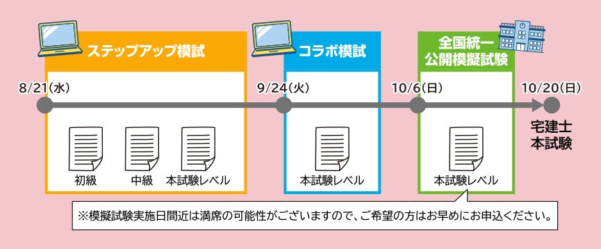学習状況のチェックや実力確認として!最後は本試験に向けた予行演習として!日建学院ではWeb受験・会場受験などあなたのスタイルに合った模擬試験をご提供しています。以下の受験スケジュール例を参考に、各模擬試験を受験して今年の宅建試験合格を目指しましょう!