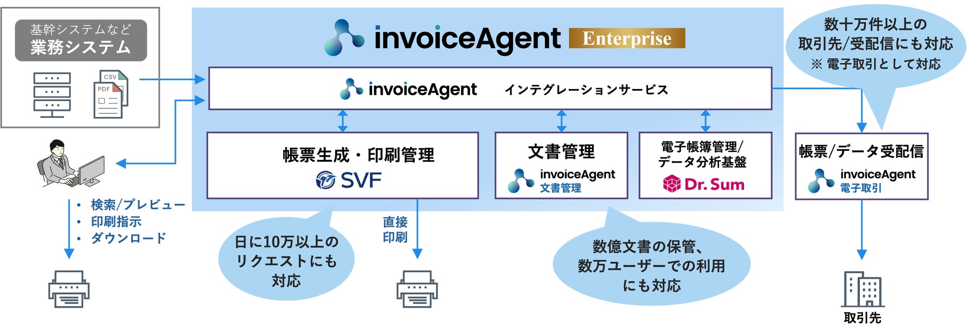 こうした課題に対し、「invoiceAgent Enterprise Cloud」は、大企業向けの統合帳票基盤サービスとして提供を開始します。本サービスは、日単位で数十万リクエストの帳票出力、数万ユーザーによる利用、数億ファイルの文書保管、さらに数十万件以上の受配信にスムーズに対応が可能です。