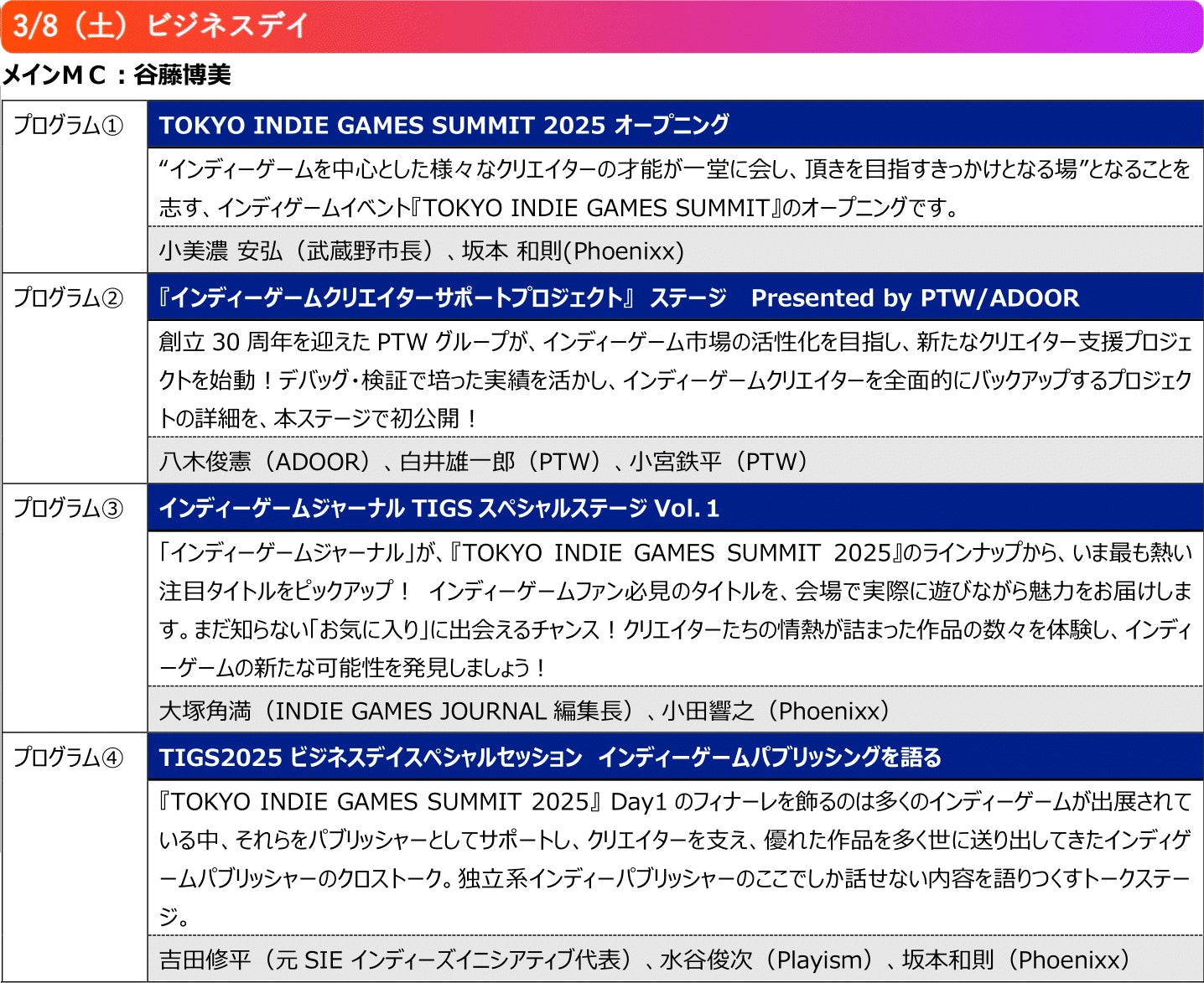 株式会社Phoenixx(フィーニックス)(東京都武蔵野市、代表取締役社長:坂本 和則)は2025年3月8日(土)~9日(日)吉祥寺エリアにて開催されるインディーゲームのお祭り『TOKYO INDIE GAMES SUMMIT 2025』で開催される吉祥寺各エリアでのイベント実施の詳細情報、ならびに武蔵野公会堂で2日間にわたって開催されるステージプログラムと出演者についても新たに情報公開したことをお知らせいたします。また、出展されるゲームタイトル、ご協賛・ご協力企業様の追加発表についても合わせてお知らせいたします。