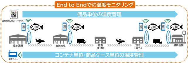 貼り付けた対象物そのものの温度を検知する『MiWAKERUⓇ』の温度検知QRコードラベルをカンパチに貼り付け、カンパチ自体の温度検知を行います。また、商品ケース内外に温度ロガー*1を設置することで、カンパチ周辺の環境温度も測定します。個品単位からコンテナ単位に至る広範囲で厳密な温度モニタリングを実施し、輸送品質の見える化を実現いたします。