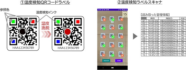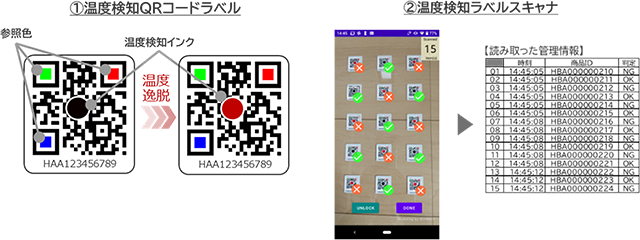 ① 管理温度を逸脱すると色が変化するインクを付与したQRコードラベル:「温度検知QRコードラベル」
